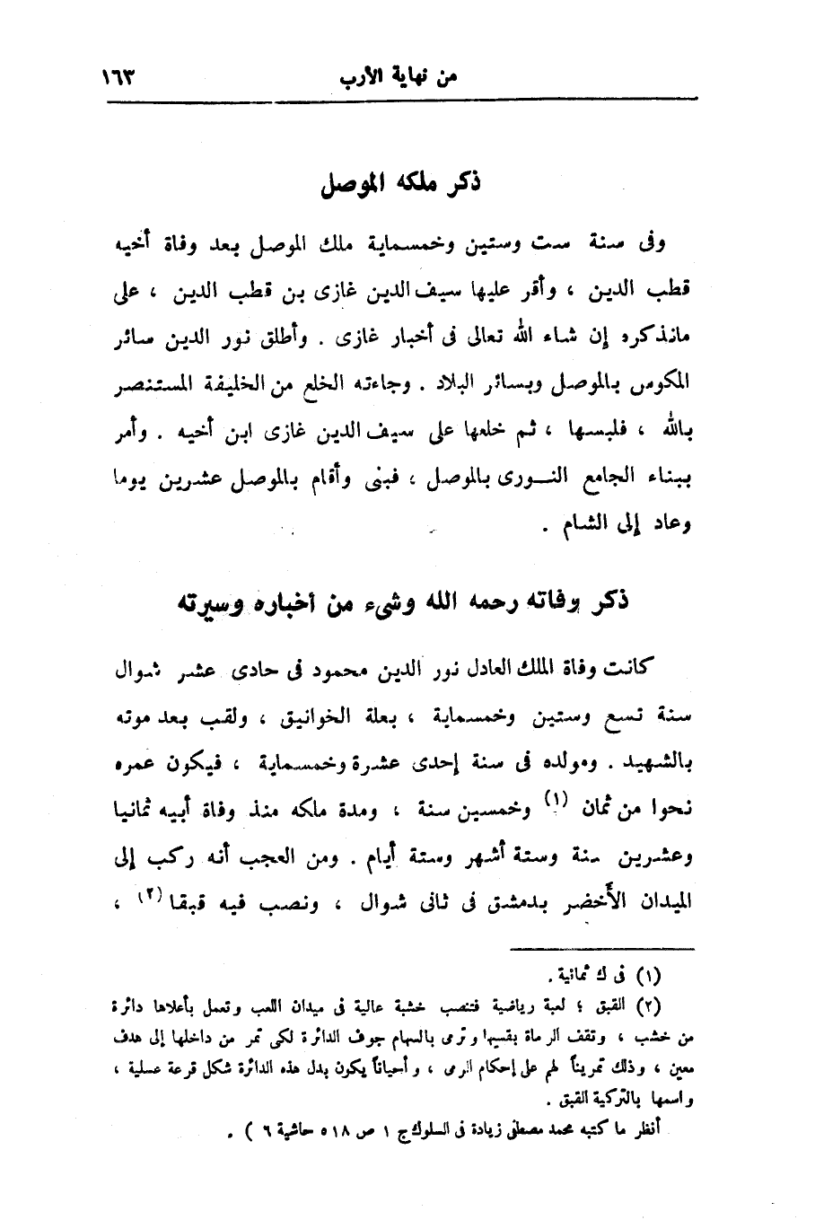كانت وفاة الملك العادل نور الدين محمود فى حادى عشر شوال سنة تسع وستين وخمسماية، بعلة الخوانيق، ولقب بعد موته بالشهيد. ومولده فى سنة إحدى عشرة وخمسماية، فيكون عمره نحوا من ثمان «1» وخمسين سنة، ومدة ملكه منذ وفاة أبيه ثمانيا وعشرين سنة وستة أشهر وستة أيام. ومن العجب أنه ركب إلى الميدان الأخضر بدمشق فى ثانى شوال، ونصب فيه قبقا «2» ،