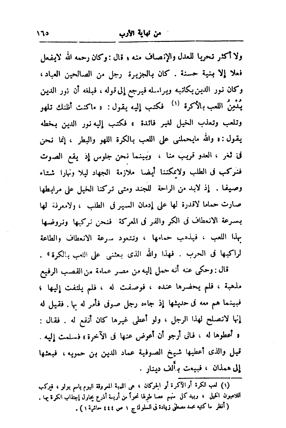 ولا أكثر تحريا للعدل والإنصاف منه» قال: وكان رحمه الله لا يفعل فعلا إلا بنية حسنة. كان بالجزيرة رجل من الصالحين العباد، وكان نور الدين يكاتبه ويراسله فيرجع إلى قوله، فبلغه أن نور الدين يدمن اللعب بالأكرة «1» فكتب إليه يقول: «ما كنت أظنك تلهو وتلعب وتعذب الخيل لغير فائدة» فكتب إليه نور الدين بخطه يقول: «والله ما يحملنى على اللعب بالكرة اللهو والبطر، إنما نحن فى ثغر، العدو قريب منا، وبينما نحن جلوس إذ يقع الصوت فنركب فى الطلب ولا يمكننا أيضا ملازمة الجهاد ليلا ونهارا شتاء وصيفا. إذ لا بد من الراحة للجند ومتى تركنا الخيل على مرابطها صارت حماما لا قدرة لها على إدمان السير فى الطلب، ولا معرفة لها بسرعة الانعطاف فى الكر والفر فى المعركة فنحن نركبها ونروضها بهذا اللعب، فيذهب حمامها، وتتعود سرعة الانعطاف والطاعة لراكبها فى الحرب. فهذا والله الذى بعثنى على اللعب بالكرة» .