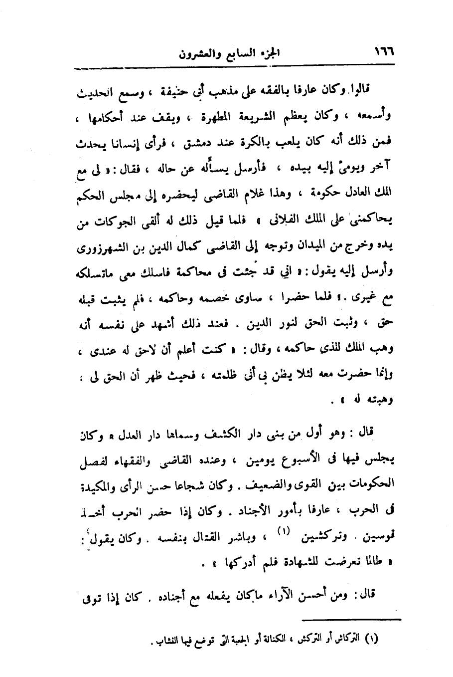 قالوا وكان عارفا بالفقه على مذهب أبى حنيفة، وسمع الحديث وأسمعه، وكان يعظم الشريعة المطهرة، ويقف عند أحكامها، فمن ذلك أنه كان يلعب بالكرة عند دمشق، فرأى إنسانا يحدث آخر ويومئ إليه بيده، فأرسل يسأله عن حاله، فقال: «لى مع الملك العادل حكومة، وهذا غلام القاضى ليحضره إلى مجلس الحكم يحاكمنى على الملك الفلانى» فلما قيل ذلك له ألقى الجوكات من يده وخرج من الميدان وتوجه إلى القاضى كمال الدين بن الشهرزورى وأرسل إليه يقول: «انى قد جئت فى محاكمه فاسلك معى ما تسلكه مع غيرى.» فلما حضرا، ساوى خصمه وحاكمه، فلم يثبت قبله حق، وثبت الحق لنور الدين. فعند ذلك أشهد على نفسه أنه وهب الملك للذى حاكمه، وقال: «كنت أعلم أن لاحق له عندى، وإنما حضرت معه لئلا يظن بى أنى ظلمته، فحيث ظهر أن الحق لى، وهبته له» .