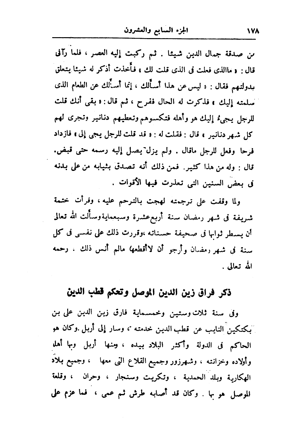 من صدقة جمال الدين شيئا. ثم ركبت إليه العصر، فلما رآنى قال: «ما الذى فعلت فى الذى قلت لك» فأخذت أذكر له شيئا يتعلق بدولتهم فقال: «ليس عن هذا أسألك، إنما أسألك عن الطعام الذى سلمته إليك» فذكرت له الحال ففرح، ثم قال: «بقى أنك قلت للرجل يجىء إليك هو وأهله فتكسوهم وتعطيهم دنانير وتجرى لهم كل شهر دنانير» قال: فقلت له: «قد قلت للرجل يجى إلى» فازداد فرحا وفعل للرجل ما قال. ولم يزل يصل إليه رسمه حتى قبض.