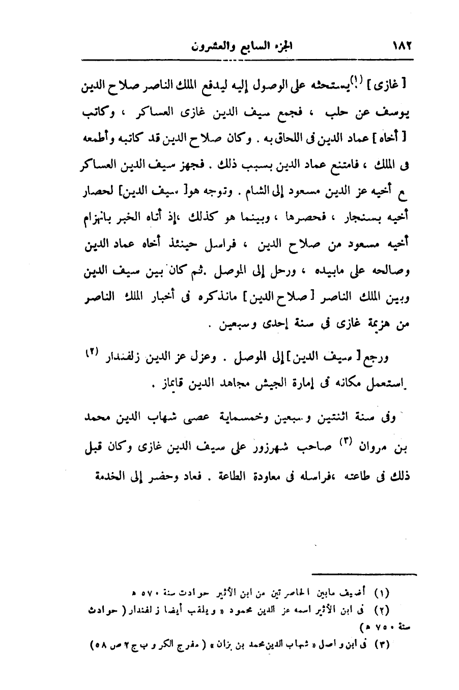 [غازى] «1» يستحثه على الوصول إليه ليدفع الملك الناصر صلاح الدين يوسف عن حلب، فجمع سيف الدين غازى العساكر، وكاتب [أخاه] عماد الدين فى اللحاق به. وكان صلاح الدين قد كاتبه وأطمعه فى الملك، فامتنع عماد الدين بسبب ذلك. فجهز سيف الدين العساكر مع أخيه عز الدين مسعود إلى الشام. وتوجه هو [سيف الدين] لحصار أخيه بسنجار، فحصرها، وبينما هو كذلك، إذ أتاه الخبر بانهزام أخيه مسعود من صلاح الدين، فراسل حينئذ أخاه عماد الدين وصالحه على ما بيده، ورحل إلى الموصل. ثم كان بين سيف الدين وبين الملك الناصر [صلاح الدين] ما نذكره فى أخبار الملك الناصر من هزيمة غازى فى سنة إحدى وسبعين.