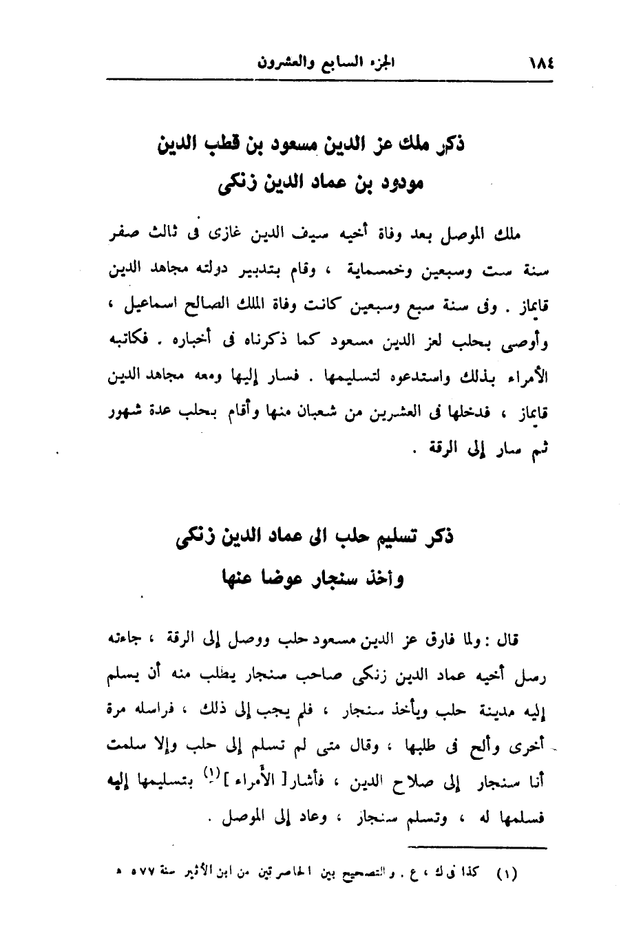 قال: ولما فارق عز الدين مسعود حلب ووصل إلى الرقة، جاءته رسل أخيه عماد الدين زنكى صاحب سنجار يطلب منه أن يسلم إليه مدينة حلب ويأخذ سنجار، فلم يجب إلى ذلك، فراسله مرة أخرى وألح فى طلبها، وقال متى لم تسلم إلى حلب وإلا سلمت أنا سنجار إلى صلاح الدين، فأشار [الأمراء] «1» بتسليمها إليه فسلمها له، وتسلم سنجار، وعاد إلى الموصل.