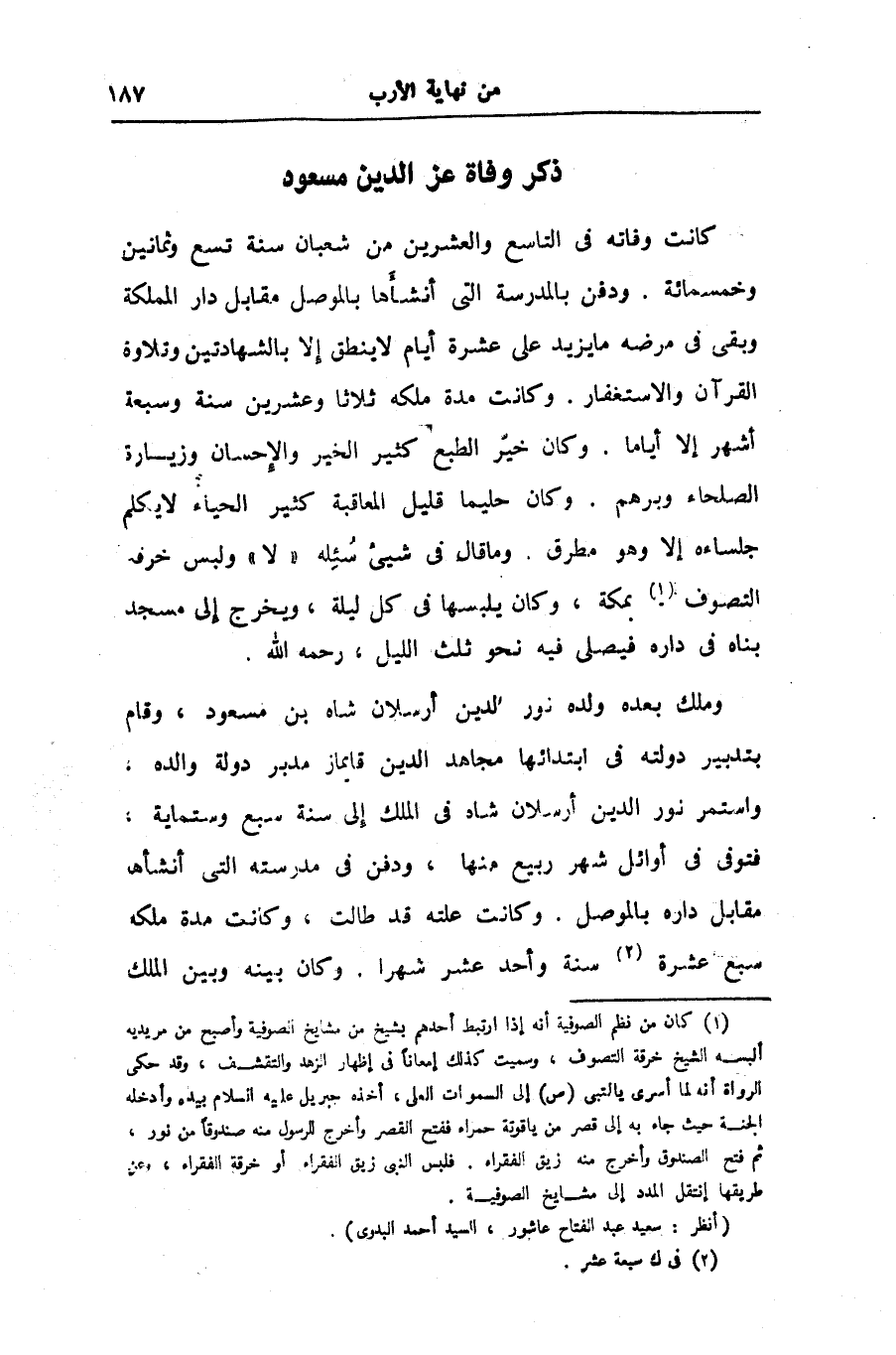 وملك بعده ولده نور الدين أرسلان شاه بن مسعود، وقام بتدبير دولته فى ابتدائها مجاهد الدين قايماز مدبر دولة والده، واستمر نور الدين أرسلان شاه فى الملك إلى سنة سبع وستماية، فتوفى فى أوائل شهر ربيع منها، ودفن فى مدرسته التى أنشأها مقابل داره بالموصل. وكانت علته قد طالت، وكانت مدة ملكه سبع عشرة «2» سنة وأحد عشر شهرا. وكان بينه وبين الملك
