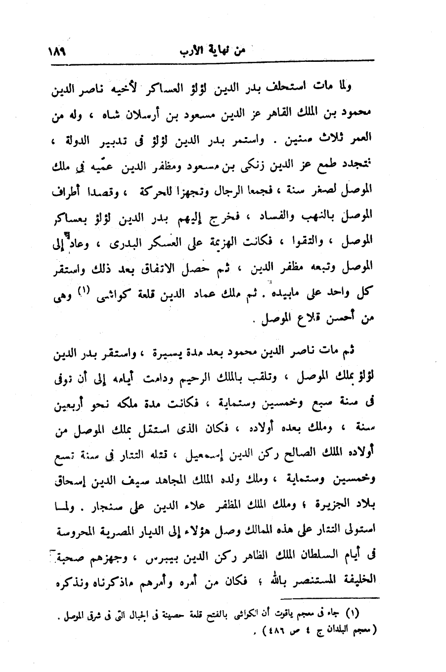 ثم مات ناصر الدين محمود بعد مدة يسيرة، واستقر بدر الدين لؤلؤ بملك الموصل، وتلقب بالملك الرحيم ودامت أيامه إلى أن توفى فى سنة سبع وخمسين وستماية، فكانت مدة ملكه نحو أربعين سنة، وملك بعده أولاده، فكان الذى استقل بملك الموصل من أولاده الملك الصالح ركن الدين إسمعيل، قتله التتار فى سنة تسع وخمسين وستماية، وملك ولده الملك المجاهد سيف الدين إسحاق بلاد الجزيرة؛ وملك الملك المظفر علاء الدين على سنجار. ولما استولى التتار على هذه الممالك وصل هؤلاء إلى الديار المصرية المحروسة فى أيام السلطان الملك الظاهر ركن الدين بيبرس، وجهزهم صحبة فى أيام السلطان الملك الظاهر ركن الدين بيبرس، وجهزهم صحبة الخليفة المستنصر بالله؛ فكان من أمره وأمرهم ما ذكرناه ونذكره
