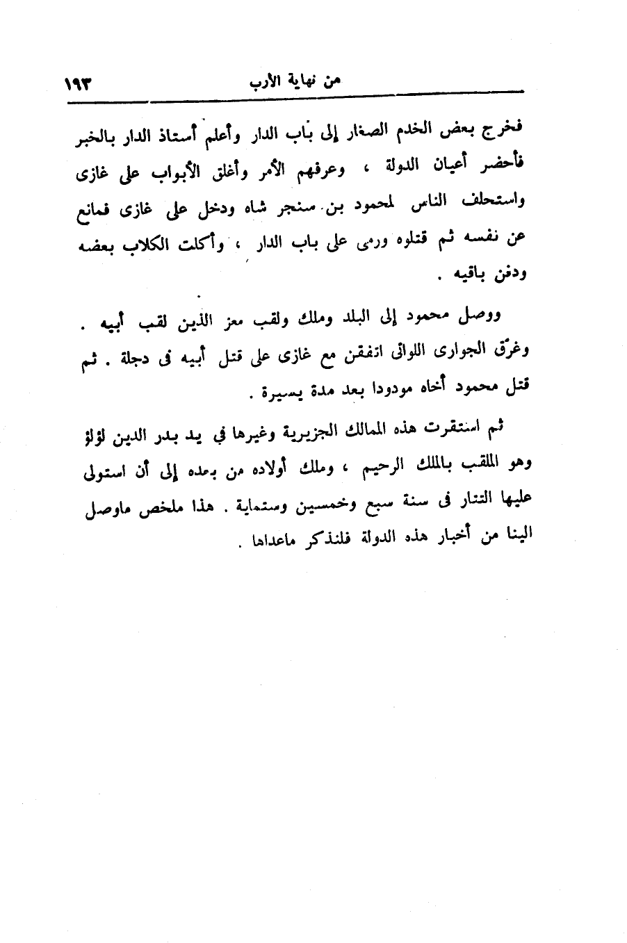 ثم استقرت هذه الممالك الجزيرية وغيرها فى يد بدر الدين لؤلؤ وهو الملقب بالملك الرحيم، وملك أولاده من بعده إلى أن استولى عليها التتار فى سنة سبع وخمسين وستماية. هذا ملخص ما وصل الينا من أخبار هذه الدولة فلنذكر ما عداها.