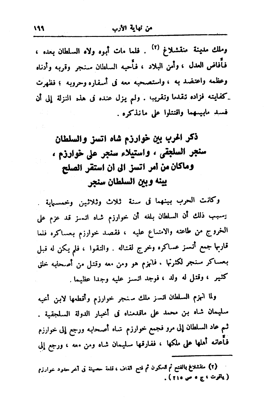 ذكر الحرب بين خوارزم شاه اتسز والسلطان سنجر السلجقى، واستيلاء سنجر على خوارزم، وما كان من أمر اتسز الى أن استقر الصلح بينه وبين السلطان سنجر