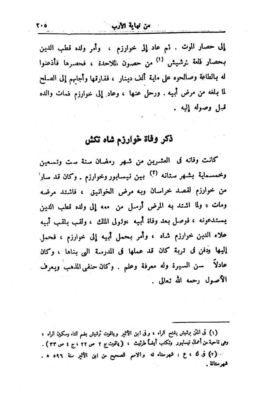 إلى حصار الموت. ثم عاد إلى خوارزم، وأمر ولده قطب الدين بحصار قلعة نرشيش «1» من حصون الملاحدة، فحصرها فأذعنوا له بالطاعة وصالحوه على ماية ألف دينار، ففارقها وأجابهم إلى الصلح لما بلغه من مرض أبيه. ورحل عنها، وعاد إلى خوارزم فمات والده قبل وصوله إليه.