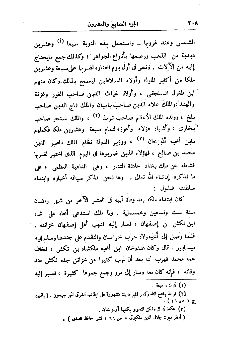 الشمس وعند غروبها- واستعمل بهذه النوبة سبعا «1» وعشرين دبدبة من الذهب ورصعها بأنواع الجواهر؛ وكذلك جمع ما يحتاج إليه من الآلات. ونص فى أول يوم اختاره لضربها على سبعة وعشرين ملكا من أكابر الملوك وأولاد السلاطين ليسمع بذلك. وكان منهم ابن طغرل السلجقى، وأولاد غياث الدين صاحب الغور وغزنة والهند، والملك علاء الدين صاحب باميان والملك تاج الدين صاحب بلخ، وولده الملك الأعظم صاحب ترمذ «2» ، والملك سنجر صاحب بخارى، وأشباه هؤلاء وأعوزه لتمام سبعة وعشرين ملكا فكملهم بابن أخيه أدبزخان «3» ، ووزير الدولة نظام الملك ناصر الدين محمد بن صالح، فهؤلاء الذين ضربوها فى اليوم الذى اختير لضربها فشغله عن ملك بغداد حادثة التتار، وهى الداهية العظمى؛ على ما نذكره إن شاء الله تعالى. وها نحن نذكر سياقه أخباره وابتداء سلطنته فنقول: