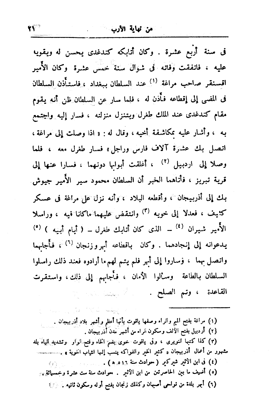 فى سنة أربع عشرة. وكان أتابكه كندغدى يحسن له ويقويه عليه، فاتفقت وفاته فى شوال سنة خمس عشرة وكان الأمير اقسنقر صاحب مراغة «1» عند السلطان ببغداد، فاستأذن السلطان فى المضى إلى إقطاعه فأذن له، فلما سار عن السلطان ظن أنه يقوم مقام كندغدى عند الملك طغرل ويتنزل منزلته، فسار إليه واجتمع به، وأشار عليه بمكاشفة أخيه، وقال له: «اذا وصلت إلى مراغة، اتصل بك عشرة آلاف فارس وراجل» فسار طغرل معه، فلما وصلا إلى اردبيل «2» ، أغلقت أبوابها دونهما، فسارا عنها إلى قرية تبريز، فأتاهما الخبر أن السلطان محمود سير الأمير جيوش بك إلى أذربيجان، وأقطعه البلاد، وأنه نزل على مراغة فى عسكر كثيف، فعدلا إلى خويه «3» وانتقض عليهما ما كانا فيه، وراسلا الأمير شيران «4» - الذى كان أتابك طغرل- (أيام أبيه) «5» يدعوانه إلى إنجادهما. وكان باقطاعه أبهر وزنجان «6» ، فأجابهما واتصل بهما، وساروا إلى أبهر فلم يتم لهم ما أرادوه فعند ذلك راسلوا السلطان بالطاعة وسألوا الأمان، فأجابهم إلى ذلك، واستقرت القاعدة، وتم الصلح.