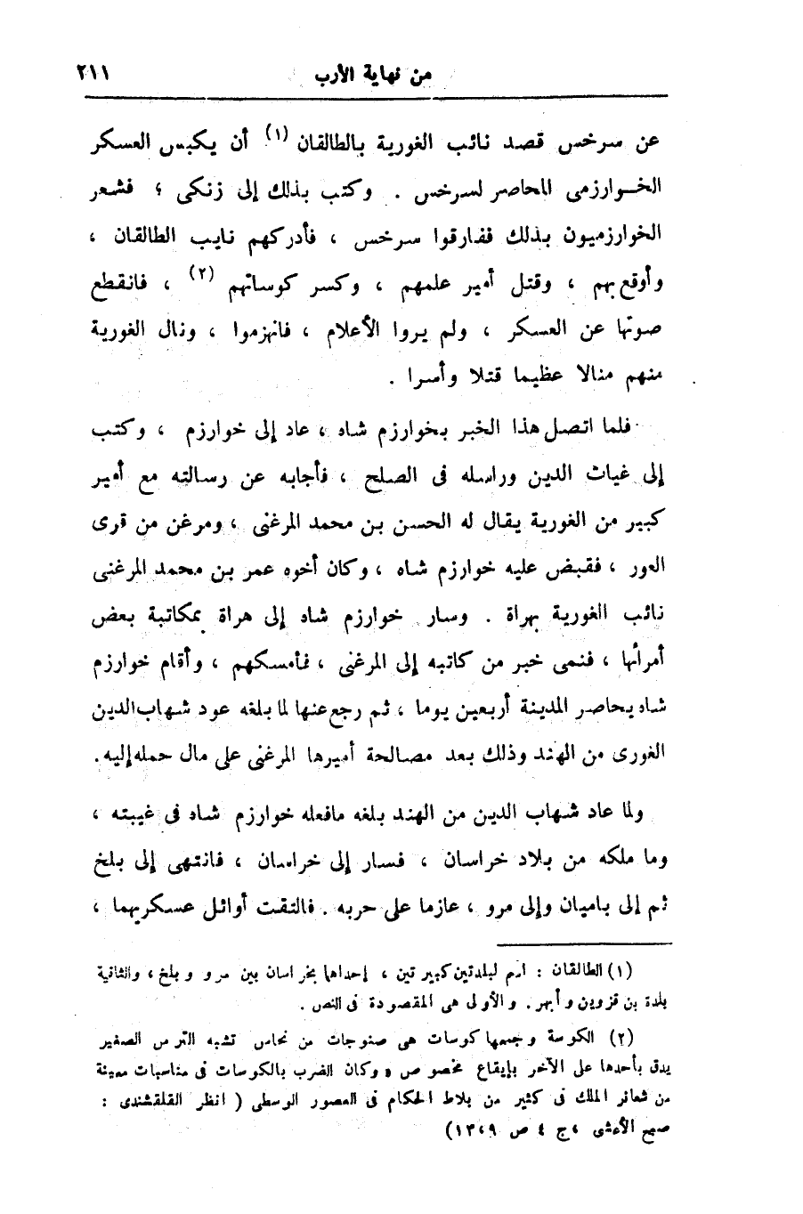 عن سرخس قصد نائب الغورية بالطالقان «1» أن يكبس العسكر الخوارزمى المحاصر لسرخس. وكتب بذلك إلى زنكى؛ فشعر الخوارزميون بذلك ففارقوا سرخس، فأدركهم نايب الطالقان، وأوقع بهم، وقتل أمير علمهم، وكسر كوساتهم «2» ، فانقطع صوتها عن العسكر، ولم يروا الأعلام، فانهزموا، ونال الغورية منهم منالا عظيما قتلا وأسرا.