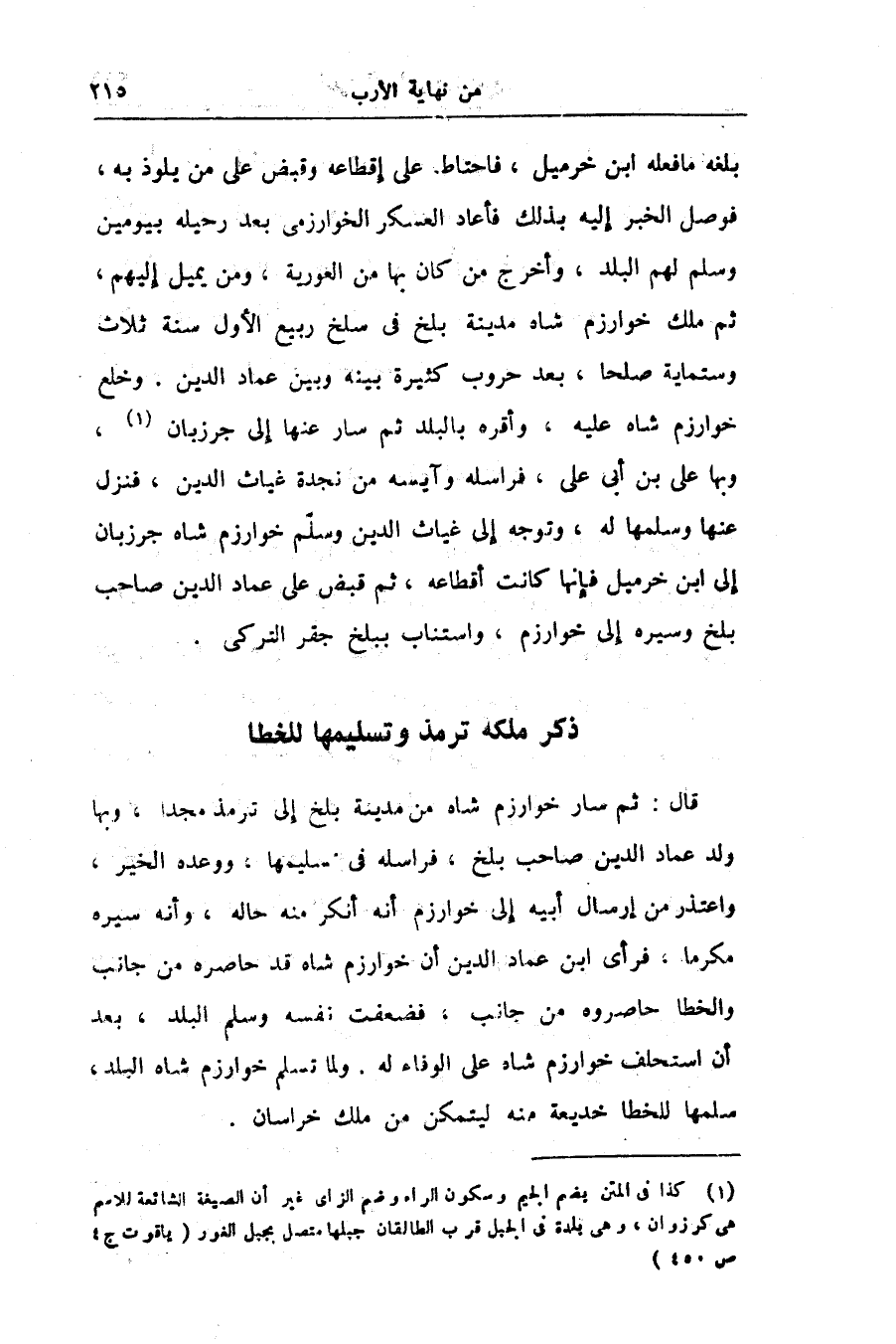 قال: ثم سار خوارزم شاه من مدينة بلخ إلى ترمذ مجدا، وبها ولد عماد الدين صاحب بلخ، فراسله فى تسليمها، ووعده الخير، واعتذر من إرسال أبيه إلى خوارزم أنه أنكر منه حاله، وأنه سيره مكرما، فرأى ابن عماد الدين أن خوارزم شاه قد حاصره من جانب والخطا حاصروه من جانب، فضعفت نفسه وسلم البلد، بعد أن استحلف خوارزم شاه على الوفاء له. ولما تسلم خوارزم شاه البلد، سلمها للخطا خديعة منه ليتمكن من ملك خراسان.