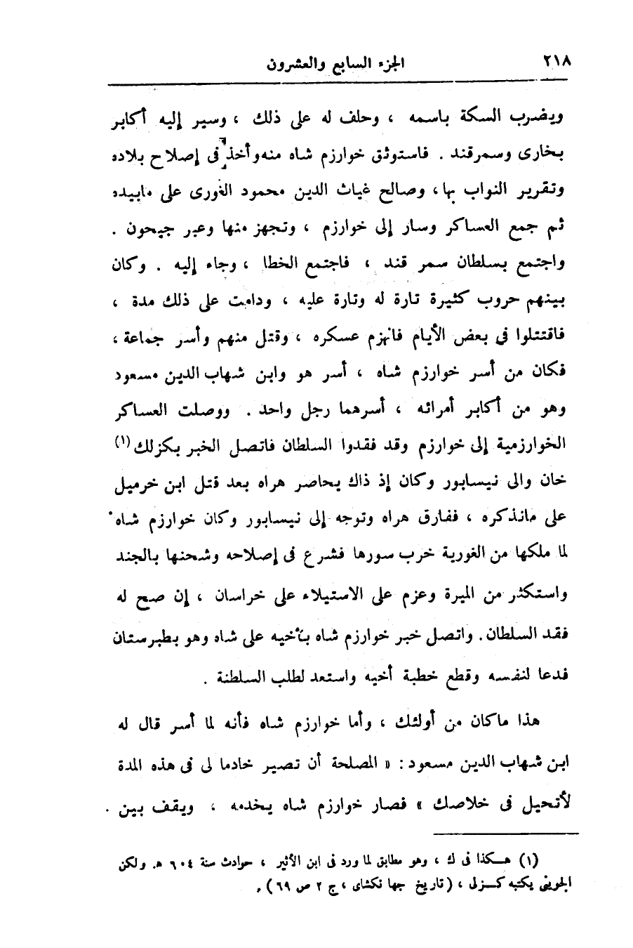هذا ما كان من أولئك، وأما خوارزم شاه فأنه لما أسر قال له ابن شهاب الدين مسعود: «المصلحة أن تصير خادما لى فى هذه المدة لأتحيل فى خلاصك» فصار خوارزم شاه يخدمه، ويقف بين.