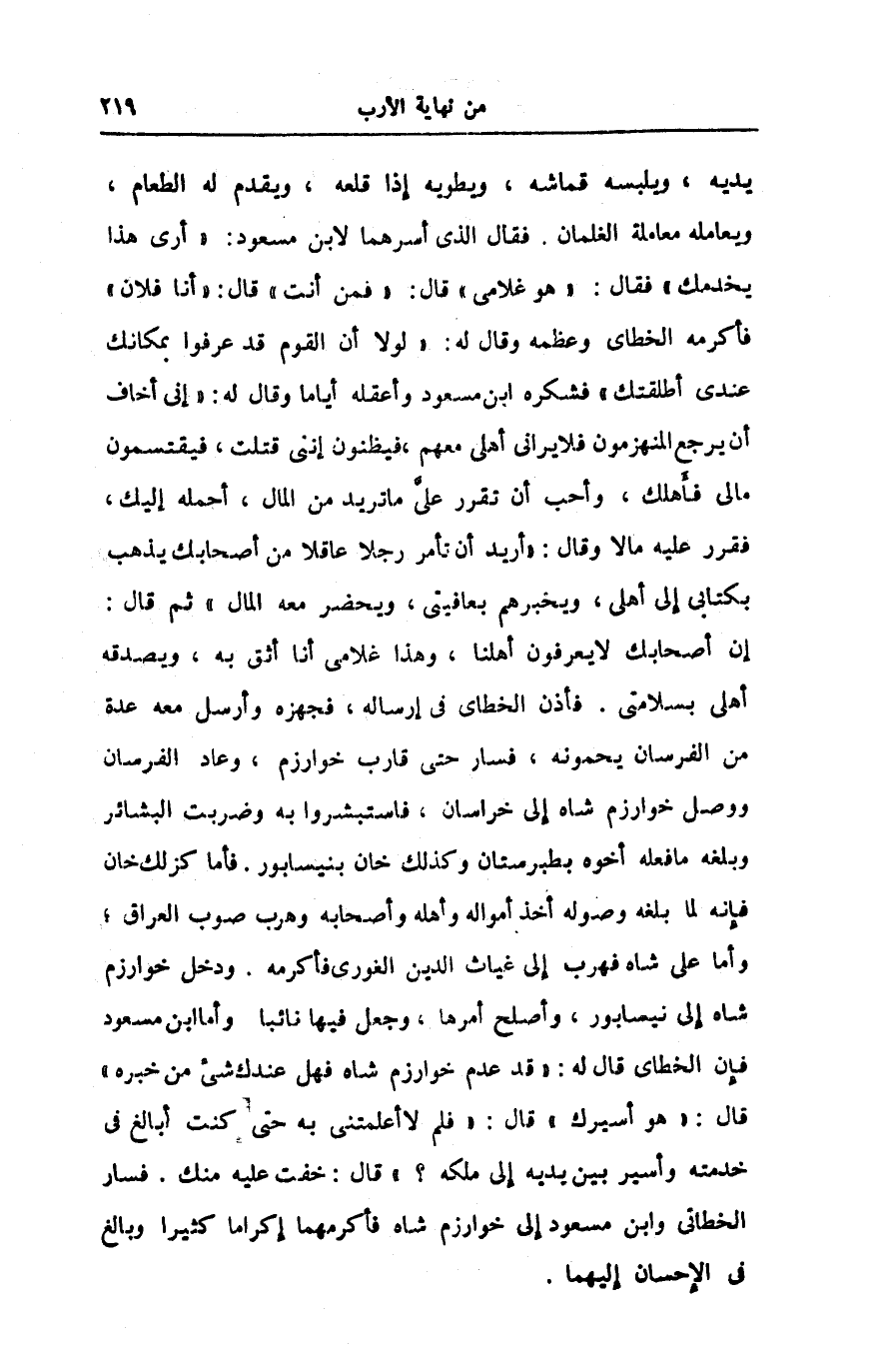 إن أصحابك لا يعرفون أهلنا، وهذا غلامى أنا أثق به، ويصدقه أهلى بسلامتى. فأذن الخطاى فى إرساله، فجهزه وأرسل معه عدة من الفرسان يحمونه، فسار حتى قارب خوارزم، وعاد الفرسان ووصل خوارزم شاه إلى خراسان، فاستبشروا به وضربت البشائر وبلغه ما فعله أخوه بطبرستان وكذلك خان بنيسابور. فأما كزلك خان فإنه لما بلغه وصوله أخذ أمواله وأهله وأصحابه وهرب صوب العراق؛ وأما على شاه فهرب إلى غياث الدين الغورى فأكرمه. ودخل خوارزم شاه إلى نيسابور، وأصلح أمرها، وجعل فيها نائبا وأما ابن مسعود فإن الخطاى قال له: «قد عدم خوارزم شاه فهل عندك شىء من خبره» قال: «هو أسيرك» قال: فلم لا أعلمتنى به حتى كنت أبالغ فى خدمته وأسير بين يديه إلى ملكه؟» قال: خفت عليه منك. فسار الخطائى وابن مسعود إلى خوارزم شاه فأكرمهما إكراما كثيرا وبالغ فى الإحسان إليهما.
