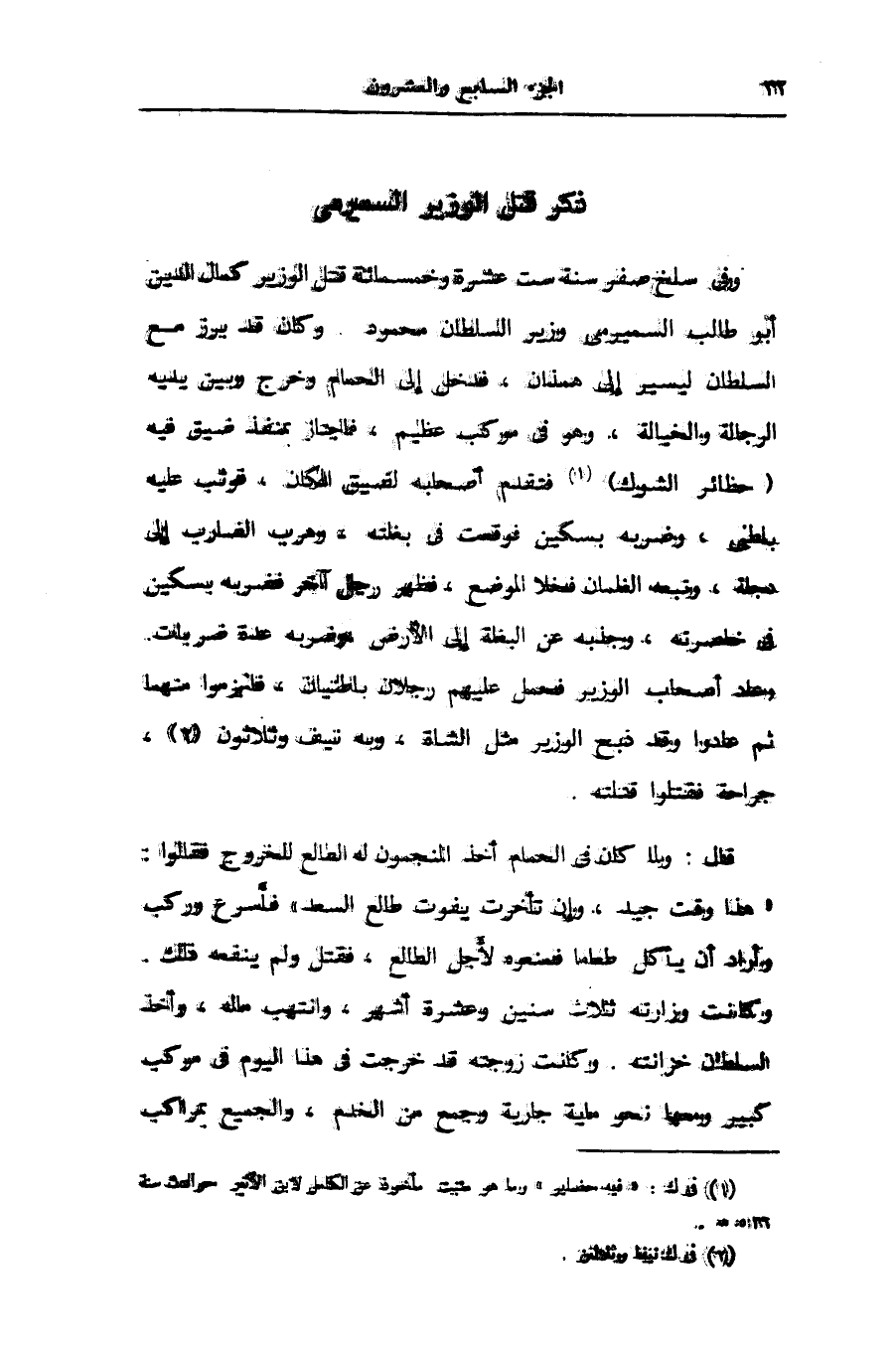 وفى سلخ صفر سنة ست عشرة وخمسمائة قتل الوزير كمال الدين أبو طالب السميرمى وزير السلطان محمود وكان قد برز مع السلطان ليسير إلى همذان، فدخل إلى الحمام وخرج وبين يديه الرجالة والخيالة، وهو فى موكب عظيم، فاجتاز بمنفذ ضيق فيه (حظائر الشوك) «1» فتقدم أصحابه لضيق المكان، فوثب عليه باطنى، وضربه بسكين فوقعت فى بغلته، وهرب الضارب إلى دجلة، وتبعه الغلمان فخلا الموضع، فظهر رجل آخر فضربه بسكين فى خاصرته، وجذبه عن البغلة إلى الأرض، وضربه عدة ضربات.