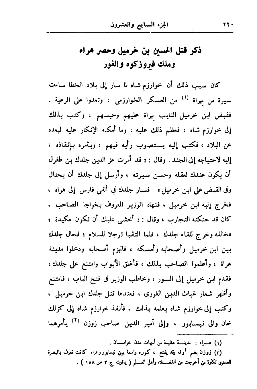 كان سبب ذلك أن خوارزم شاه لما سار إلى بلاد الخطا ساءت سيرة من بهراة «1» من العسكر الخوارزمى، وتعدوا على الرعية.