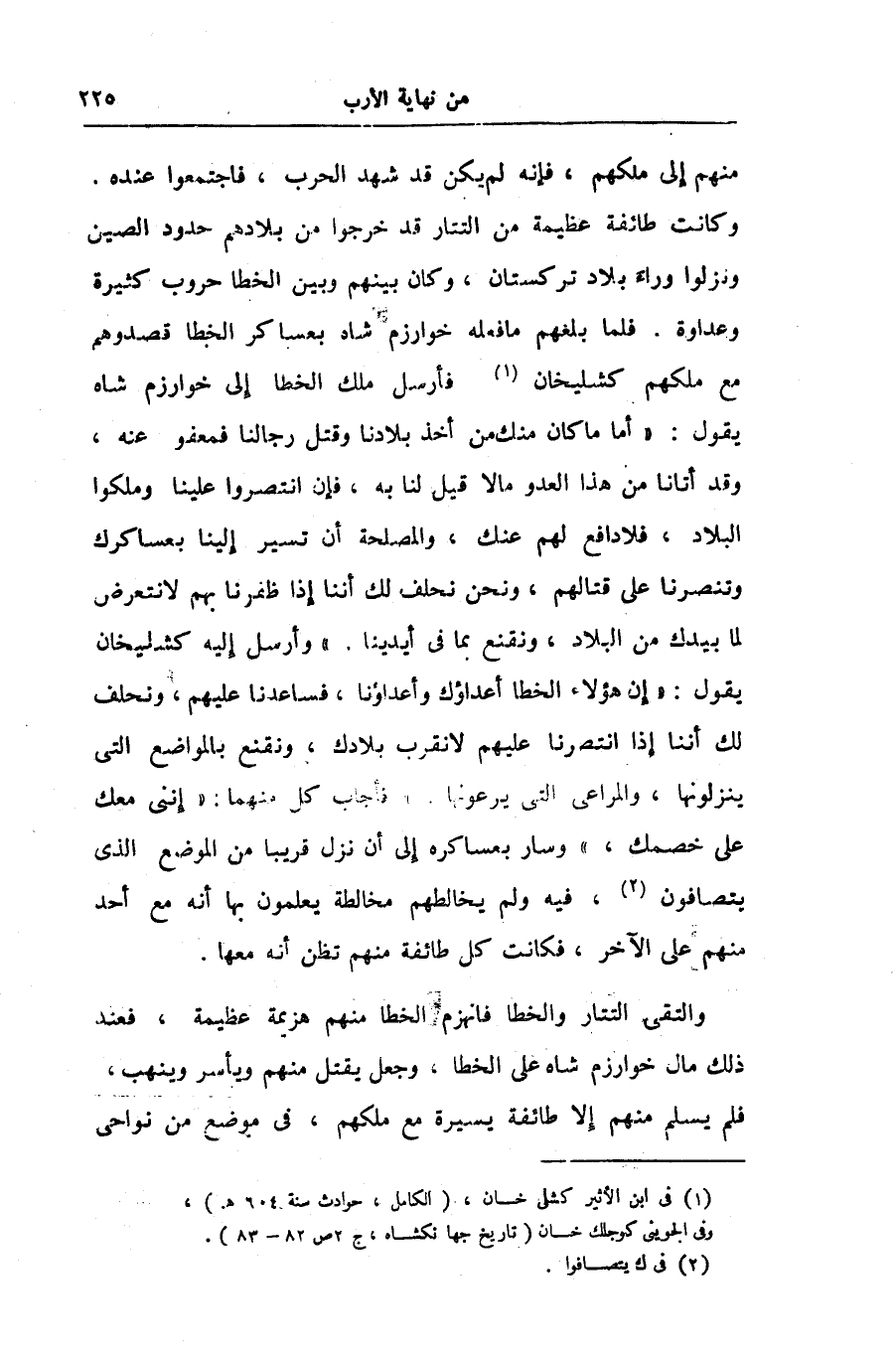 وكانت طائفة عظيمة من التتار قد خرجوا من بلادهم حدود الصين ونزلوا وراء بلاد تركستان، وكان بينهم وبين الخطا حروب كثيرة وعداوة. فلما بلغهم ما فعله خوارزم شاه بعساكر الخطا قصدوهم مع ملكهم كشليخان «1» فأرسل ملك الخطا إلى خوارزم شاه يقول: «أما ما كان منك من أخذ بلادنا وقتل رجالنا فمعفو عنه، وقد أتانا من هذا العدو مالا قيل لنا به، فإن انتصروا علينا وملكوا البلاد، فلا دافع لهم عنك، والمصلحة أن تسير إلينا بعساكرك وتنصرنا على قتالهم، ونحن نحلف لك أننا إذا ظفرنا بهم لا نتعرض لما بيدك من البلاد، ونقنع بما فى أيدينا.» وأرسل إليه كشليخان يقول: «إن هؤلاء الخطا أعداؤك وأعداؤنا، فساعدنا عليهم، ونحلف لك أننا إذا انتصرنا عليهم لا نقرب بلادك، ونقنع بالمواضع التى ينزلونها، والمراعى التى يرعونها.» فأجاب كل منهما: «إننى معك على خصمك،» وسار بعساكره إلى أن نزل قريبا من الموضع الذى يتصافون «2» ، فيه ولم يخالطهم مخالطة يعلمون بها أنه مع أحد منهم على الآخر، فكانت كل طائفة منهم تظن أنه معها.