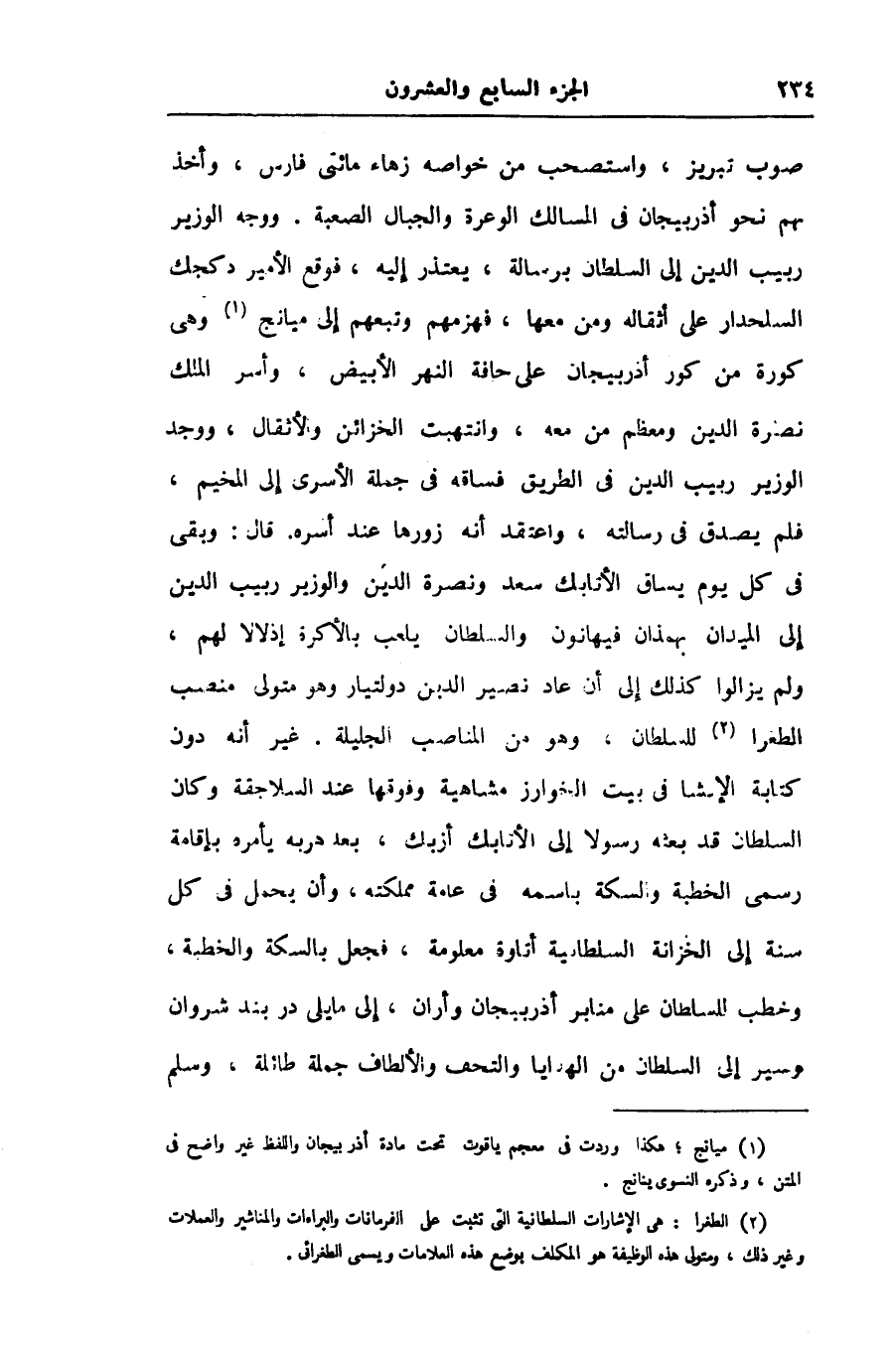 صوب تبريز، واستصحب من خواصه زهاء مائتى فارس، وأخذ بهم نحو أذربيجان فى المسالك الوعرة والجبال الصعبة. ووجه الوزير ربيب الدين إلى السلطان برسالة، يعتذر إليه، فوقع الأمير دكجك السلحدار على أثقاله ومن معها، فهزمهم وتبعهم إلى ميانج «1» وهى كورة من كور أذربيجان على حافة النهر الأبيض، وأسر الملك نصرة الدين ومعظم من معه، وانتهبت الخزائن والأثقال، ووجد الوزير ربيب الدين فى الطريق فساقه فى جملة الأسرى إلى المخيم، فلم يصدق فى رسالته، واعتقد أنه زورها عند أسره. قال: وبقى فى كل يوم يساق الأتابك سعد ونصرة الدين والوزير ربيب الدين إلى الميدان بهمذان فيهانون والسلطان يلعب بالأكرة إذلالا لهم، ولم يزالوا كذلك إلى أن عاد نصير الدين دولتيار وهو متولى منصب الطغرا «2» للسلطان، وهو من المناصب الجليلة. غير أنه دون كتابة الإنشا فى بيت الخوارزمشاهية وفوقها عند السلاجقة وكان السلطان قد بعثه رسولا إلى الأتابك أزبك، بعد هربه يأمره بإقامة رسمى الخطبة والسكة باسمه فى عامة مملكته، وأن يحمل فى كل سنة إلى الخزانة السلطانية أتاوة معلومة، فجعل بالسكة والخطبة، وخطب للسلطان على منابر أذربيجان وأران، إلى ما يلى دربند شروان وسير إلى السلطان من الهدايا والتحف والألطاف جملة طائلة، وسلم