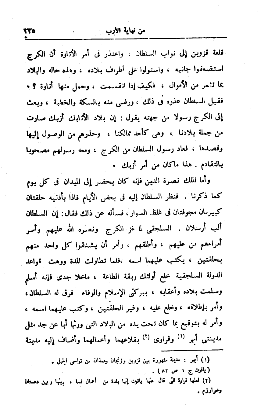 قلعة قزوين إلى نواب السلطان، واعتذر فى أمر الأتاوة أن الكرج استضعفوا جانبه، واستولوا على أطراف بلاده، وهذه حاله والبلاد بما تثمر من الأموال، فكيف إذا انقسمت، وحمل منها أتاوة؟.