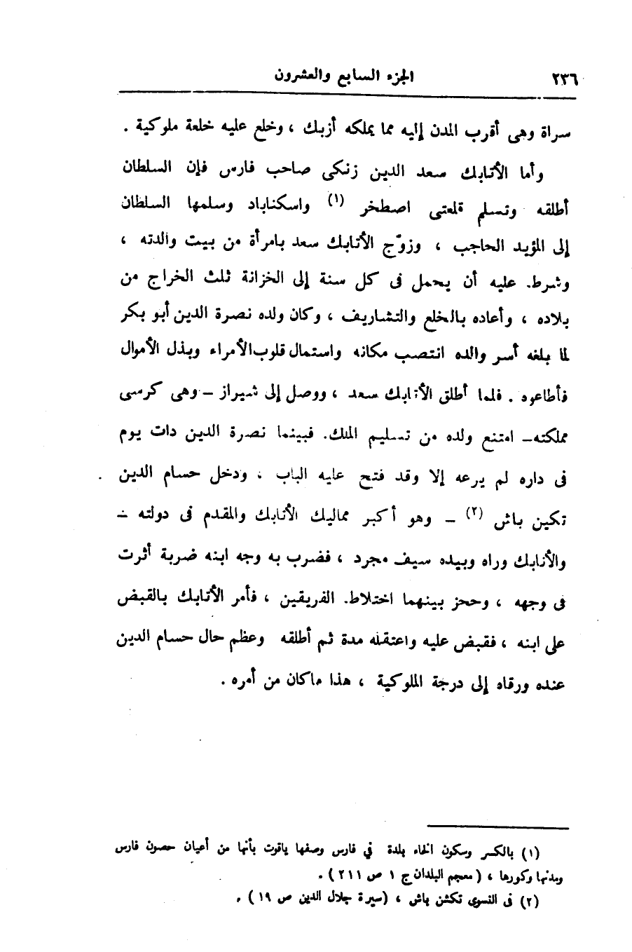 وأما الأتابك سعد الدين زنكى صاحب فارس فإن السلطان أطلقه وتسلم قلعتى اصطخر «1» واسكناباد وسلمها السلطان إلى المؤيد الحاجب، وزوّج الأتابك سعد بامرأة من بيت والدته، وشرط عليه أن يحمل فى كل سنة إلى الخزانة ثلث الخراج من بلاده، وأعاده بالخلع والتشاريف، وكان ولده نصرة الدين أبو بكر لما بلغه أسر والده انتصب مكانه واستمال قلوب الأمراء وبذل الأموال فأطاعوه. فلما أطلق الأتابك سعد، ووصل إلى شيراز- وهى كرسى مملكته- امتنع ولده من تسليم الملك. فبينما نصرة الدين دات يوم فى داره لم يرعه إلا وقد فتح عليه الباب، ودخل حسام الدين تكين باش «2» - وهو أكبر مماليك الأتابك والمقدم فى دولته- والأتابك وراه وبيده سيف مجرد، فضرب به وجه ابنه ضربة أثرت فى وجهه، وححز بينهما اختلاط الفريقين، فأمر الأتابك بالقبض على ابنه، فقبض عليه واعتقله مدة ثم أطلقه وعظم حال حسام الدين عنده ورقاه إلى درجة الملوكية، هذا ما كان من أمره.