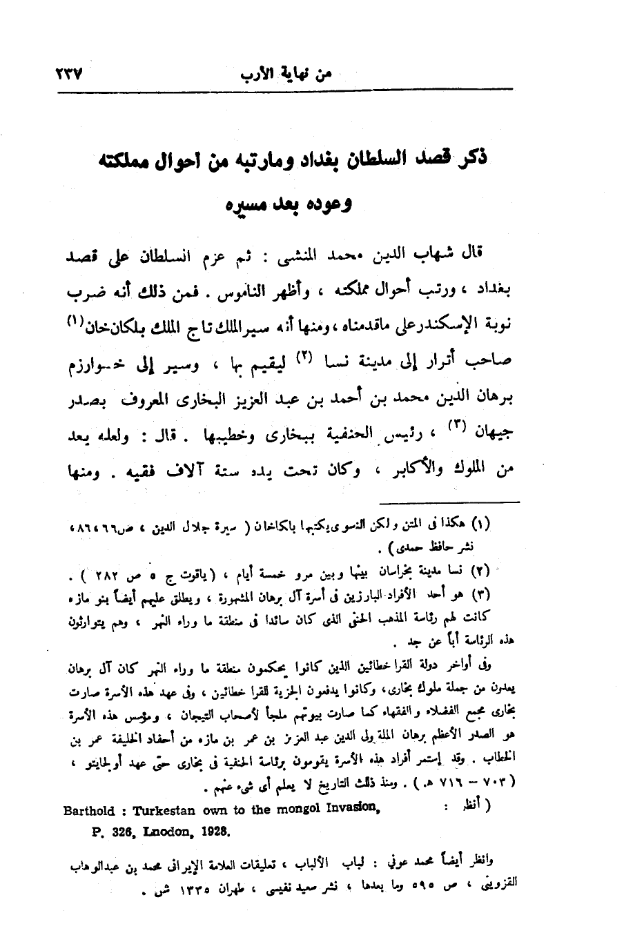 قال شهاب الدين محمد المنشى: ثم عزم السلطان على قصد بغداد، ورتب أحوال مملكته، وأظهر الناموس. فمن ذلك أنه ضرب نوبة الإسكندر على ما قدمناه، ومنها أنه سير الملك تاج الملك بلكان خان «1» صاحب أترار إلى مدينة نسا «2» ليقيم بها، وسير إلى خوارزم برهان الدين محمد بن أحمد بن عبد العزيز البخارى المعروف بصدر جيهان «3» ، رئيس الحنفية ببخارى وخطيبها. قال: ولعله بعد من الملوك والأكابر، وكان تحت يده ستة آلاف فقيه. ومنها