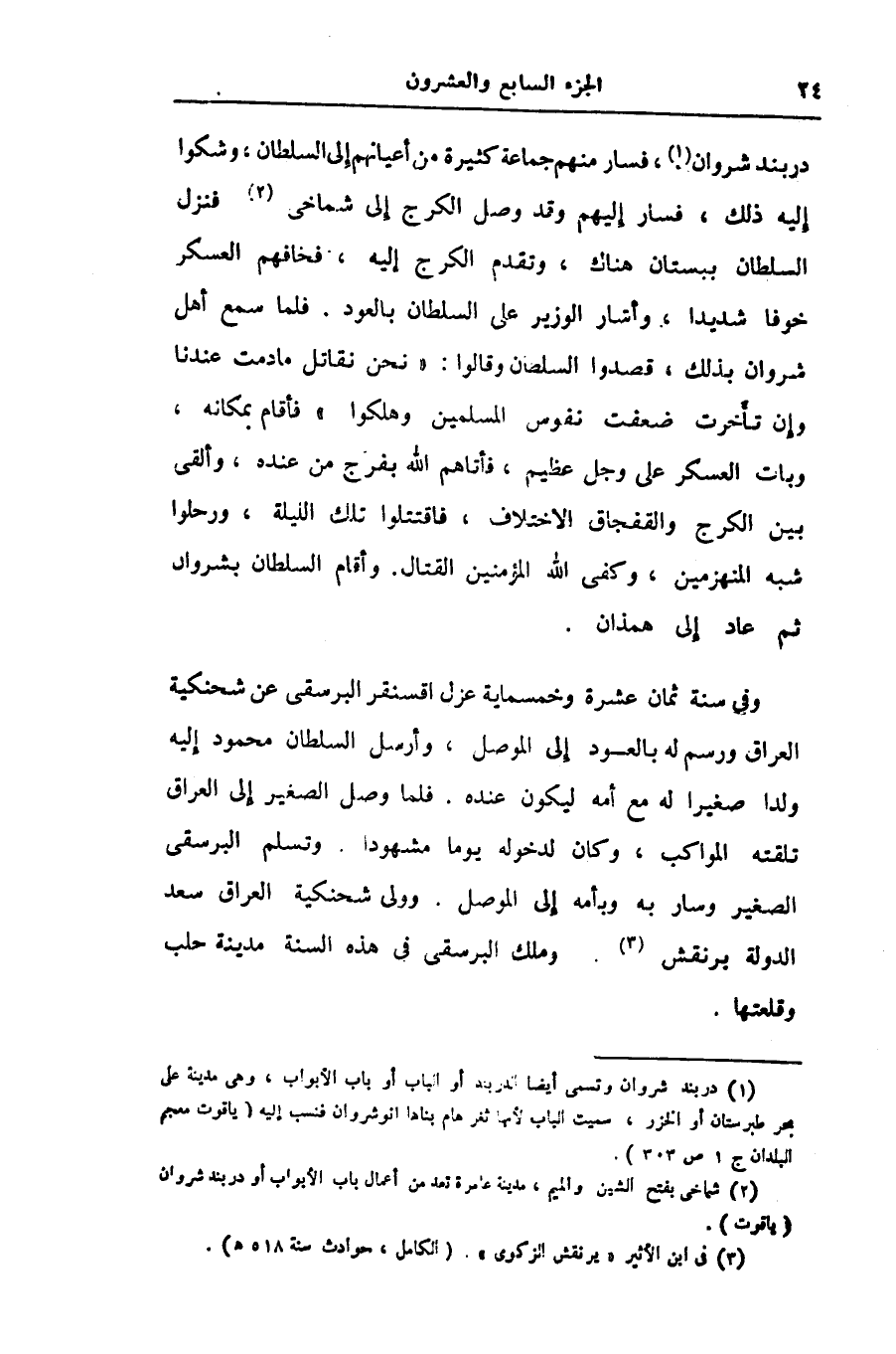 دربند شروان «1» ، فسار منهم جماعة كثيرة من أعيانهم إلى السلطان، وشكوا إليه ذلك، فسار إليهم وقد وصل الكرج إلى شماخى «2» فنزل السلطان ببستان هناك، وتقدم الكرج إليه، فخافهم العسكر خوفا شديدا، وأشار الوزير على السلطان بالعود. فلما سمع أهل شروان بذلك، قصدوا السلطان وقالوا: «نحن نقاتل ما دمت عندنا وإن تأخرت ضعفت نفوس المسلمين وهلكوا» فأقام بمكانه، وبات العسكر على وجل عظيم، فأتاهم الله بفرج من عنده، وألقى بين الكرج والقفجاق الاختلاف، فاقتتلوا تلك الليلة، ورحلوا شبه المنهزمين، وكفى الله المؤمنين القتال. وأقام السلطان بشروان ثم عاد إلى همذان.