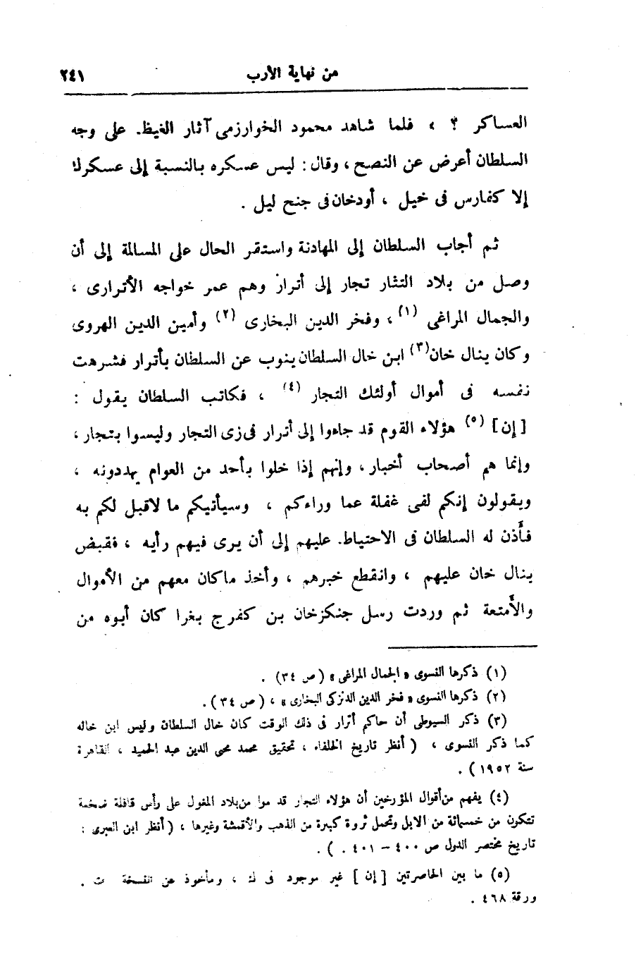 ثم أجاب السلطان إلى المهادنة واستقر الحال على المسالمة إلى أن وصل من بلاد التثار تجار إلى أترار وهم عمر خواجه الأترارى، والجمال المراغى «1» ، وفخر الدين البخارى «2» وأمين الدين الهروى وكان ينال خان «3» ابن خال السلطان ينوب عن السلطان بأترار فشرهت نفسه فى أموال أولئك التجار «4» ، فكاتب السلطان يقول: