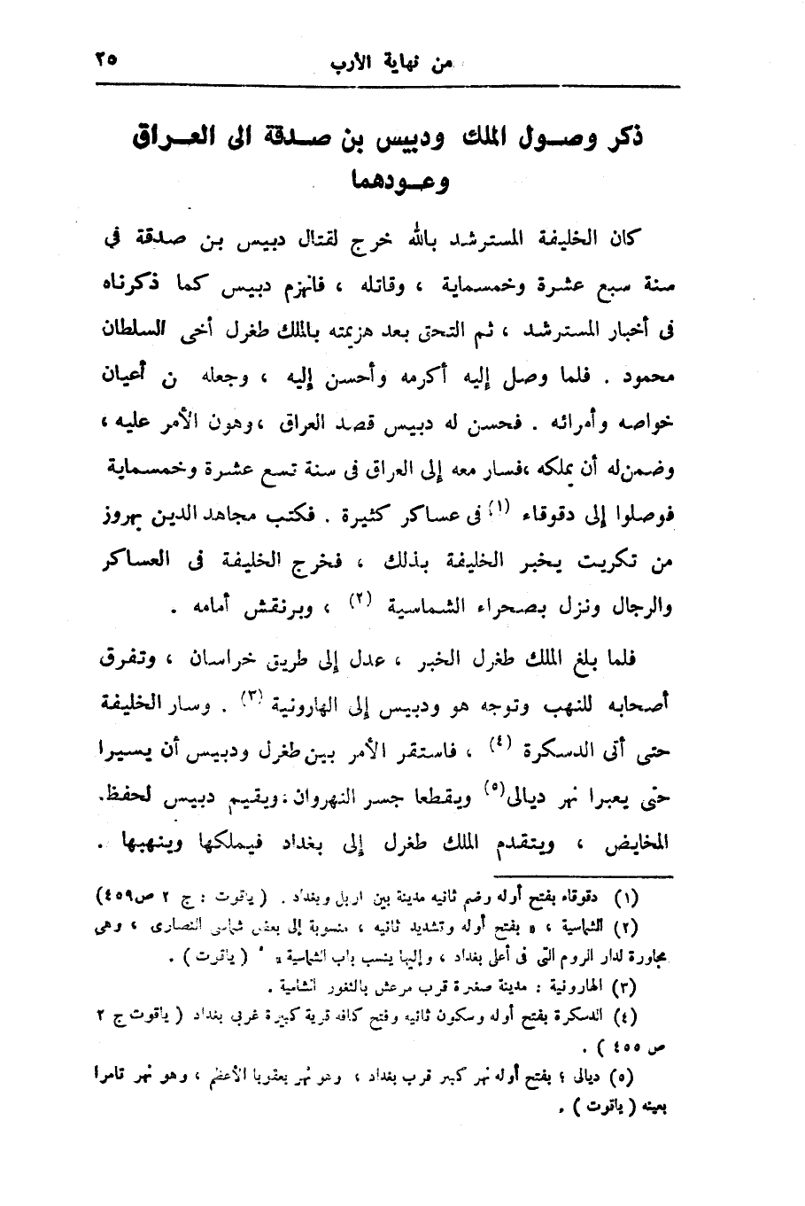 فلما بلغ الملك طغرل الخبر، عدل إلى طريق خراسان، وتفرق أصحابه للنهب وتوجه هو ودبيس إلى الهارونية «3» . وسار الخليفة حتى أتى الدسكرة «4» ، فاستقر الأمر بين طغرل ودبيس أن يسيرا حتى يعبرا نهر ديالى «5» ويقطعا جسر النهروان، ويقيم دبيس لحفظ.