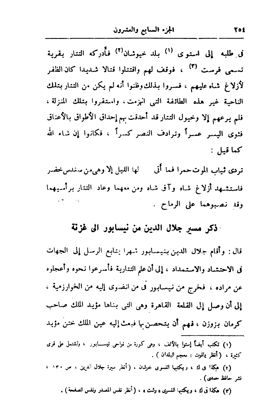 قال: وأقام جلال الدين بنيسابور شهرا يتابع الرسل إلى الجهات فى الاحتشاد والاستمداد، إلى أن علم التتارية فأسرعوا نحوه وأعجلوه عن مراده، فخرج من نيسابور فى من انضوى إليه من الخوارزمية، إلى أن وصل إلى القلعة القاهرة وهى التى بناها مؤيد الملك صاحب كرمان بزوزن، فهم أن يتحصن بها فبعث إليه عين الملك ختن مؤيد