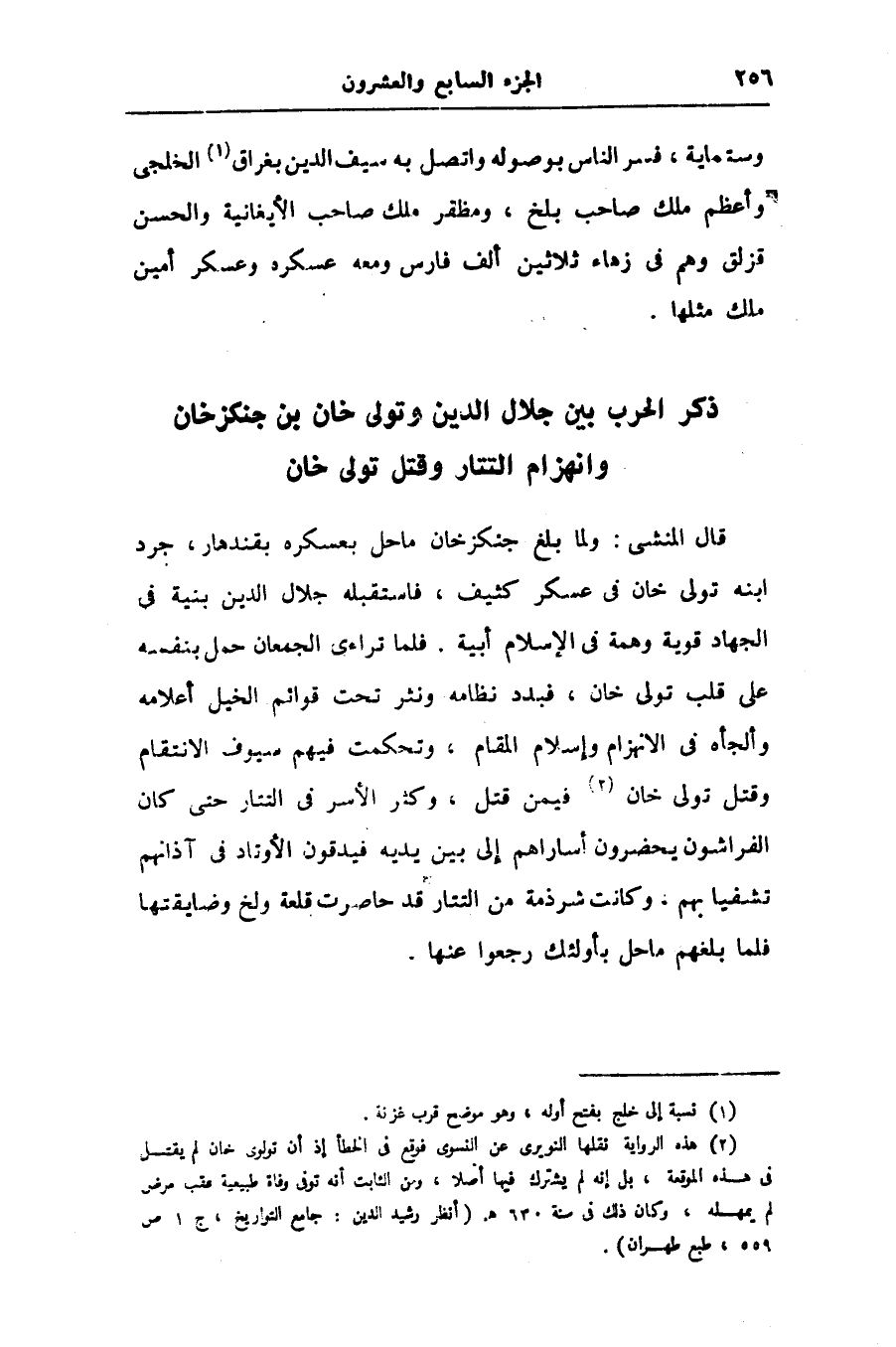 قال المنشى: ولما بلغ جنكزخان ما حل بعسكره بقندهار، جرد ابنه تولى خان فى عسكر كثيف، فاستقبله جلال الدين بنية فى الجهاد قوية وهمة فى الإسلام أبية. فلما تراءى الجمعان حمل بنفسه على قلب تولى خان، فبدد نظامه ونثر تحت قوائم الخيل أعلامه وألجأه فى الانهزام وإسلام المقام، وتحكمت فيهم سيوف الانتقام وقتل تولى خان «2» فيمن قتل، وكثر الأسر فى التتار حتى كان الفراشون يحضرون أساراهم إلى بين يديه فيدقون الأوتاد فى آذانهم تشفيا بهم، وكانت شرذمة من التتار قد حاصرت قلعة ولخ وضايقتها فلما بلغهم ما حل بأولئك رجعوا عنها.