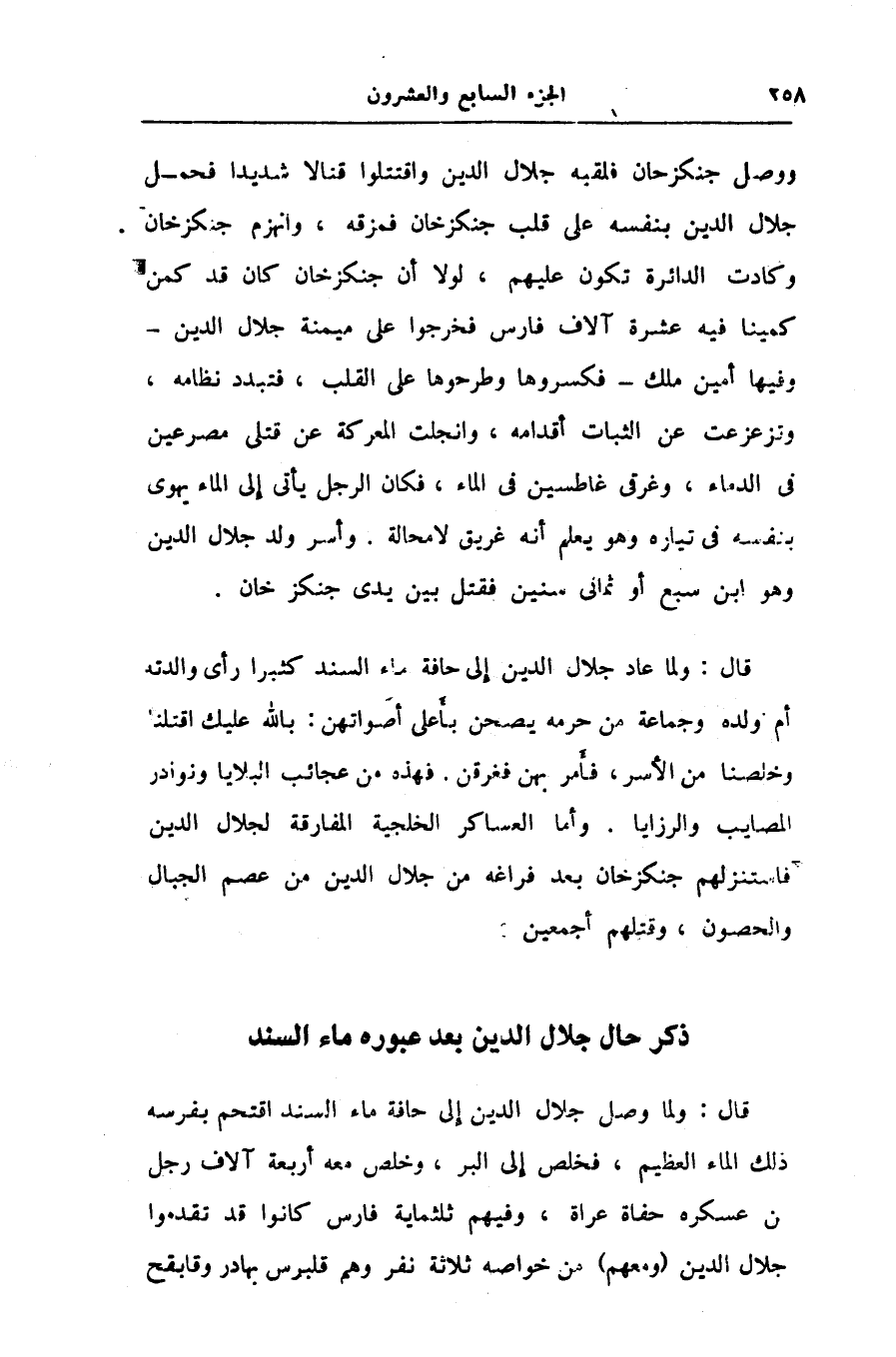 قال: ولما وصل جلال الدين إلى حافة ماء السند اقتحم بفرسه ذلك الماء العظيم، فخلص إلى البر، وخلص معه أربعة آلاف رجل من عسكره حفاة عراة، وفيهم ثلثماية فارس كانوا قد تقدموا جلال الدين (ومعهم) من خواصه ثلاثة نفر وهم قلبرس بهادر وقابقح