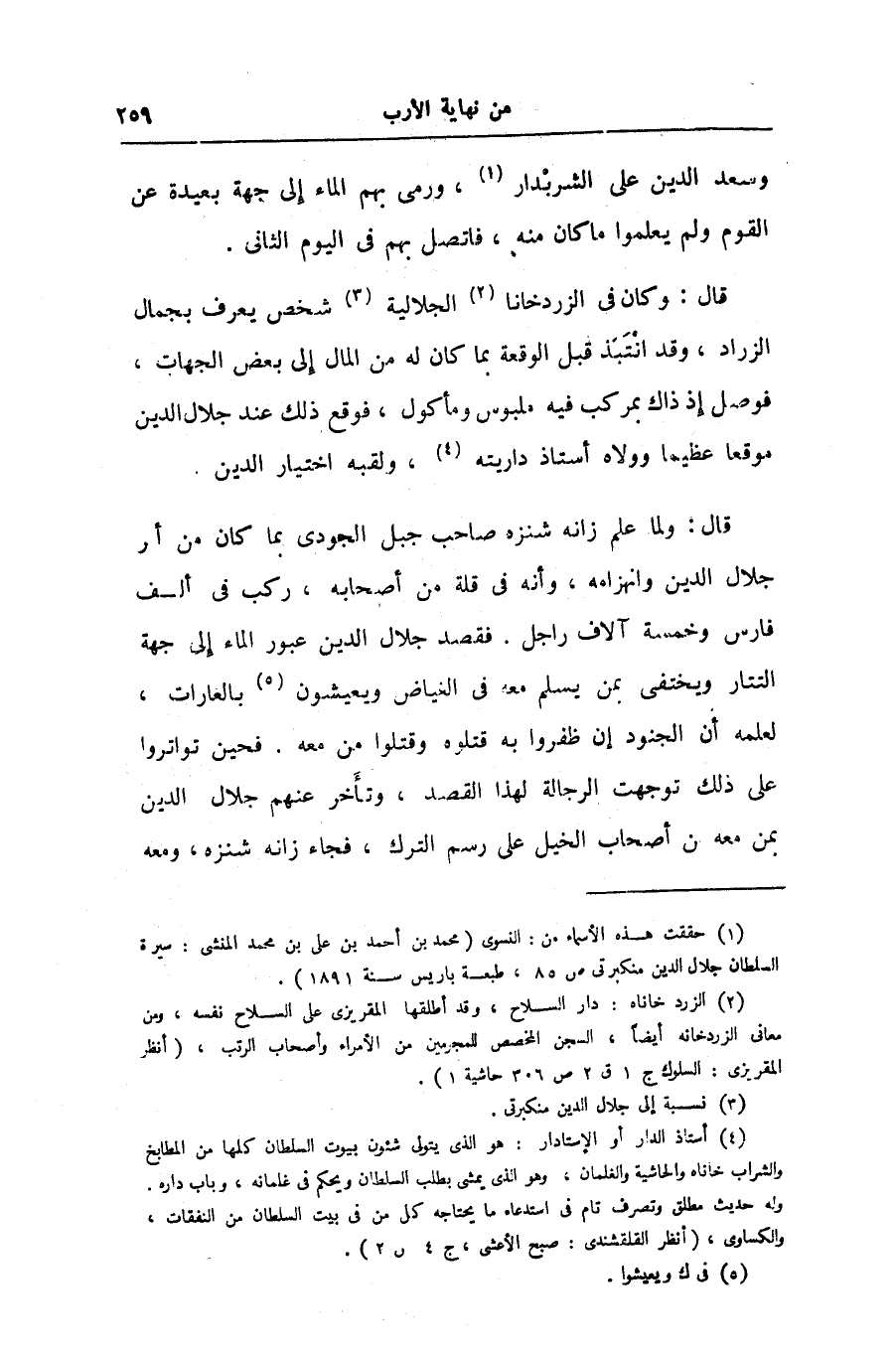 قال: ولما علم زانه شنزه صاحب جبل الجودى بما كان من أر جلال الدين وانهزامه، وأنه فى قلة من أصحابه، ركب فى ألف فارس وخمسة آلاف راجل. فقصد جلال الدين عبور الماء إلى جهة التتار ويختفى بمن يسلم معه فى الغياض ويعيشون «5» بالغارات، لعلمه أن الجنود إن ظفروا به قتلوه وقتلوا من معه. فحين تواتروا على ذلك توجهت الرجالة لهذا القصد، وتأخر عنهم جلال الدين بمن معه من أصحاب الخيل على رسم الترك، فجاء زانه شنزه، ومعه