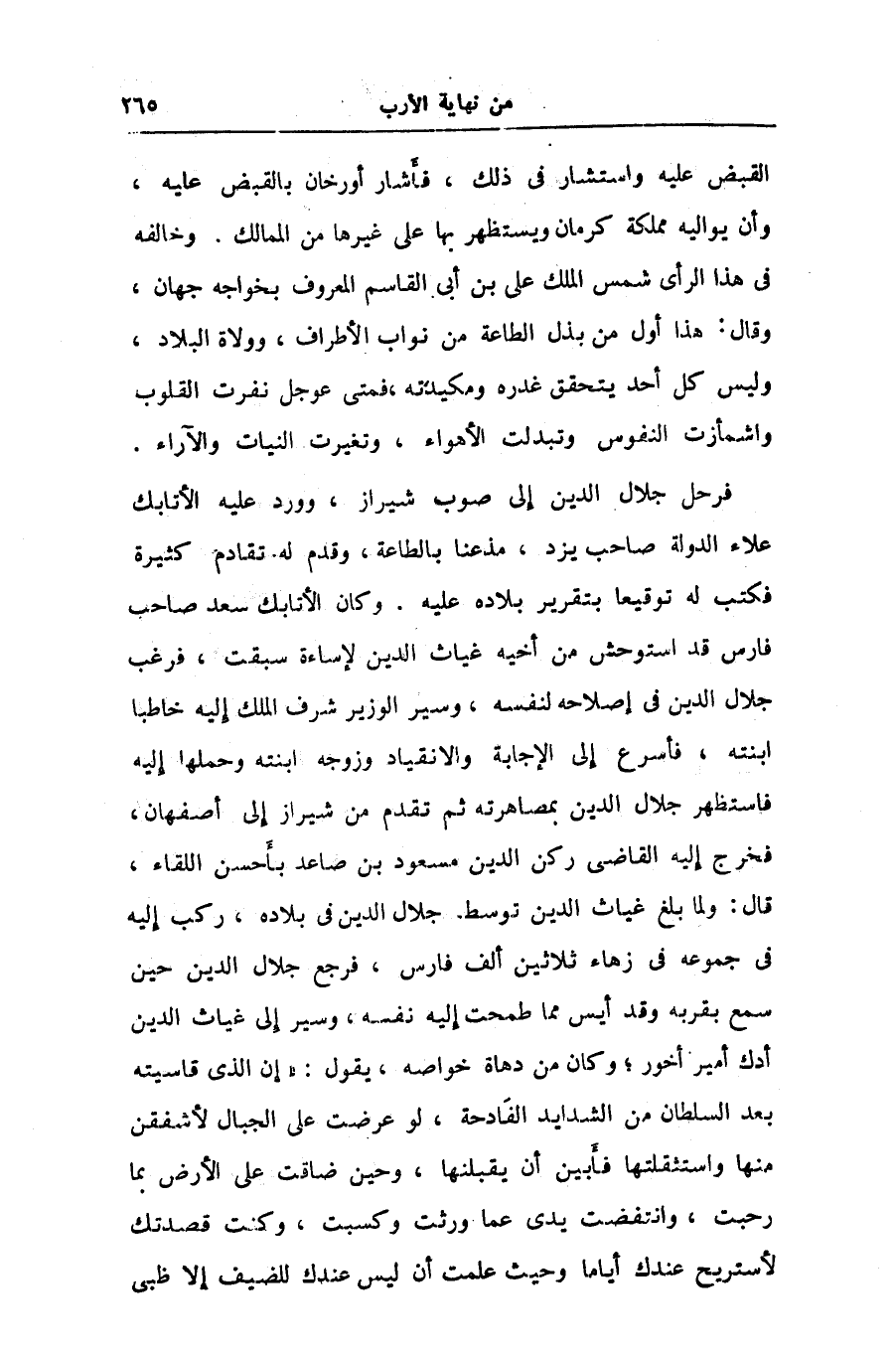 القبض عليه واستشار فى ذلك، فأشار أورخان بالقبض عليه، وأن يواليه مملكة كرمان ويستظهر بها على غيرها من الممالك. وخالفه فى هذا الرأى شمس الملك على بن أبى القاسم المعروف بخواجه جهان، وقال: هذا أول من بذل الطاعة من نواب الأطراف، وولاة البلاد، وليس كل أحد يتحقق غدره ومكيدته، فمتى عوجل نفرت القلوب واشمأزت النفوس وتبدلت الأهواء، وتغيرت النيات والآراء.