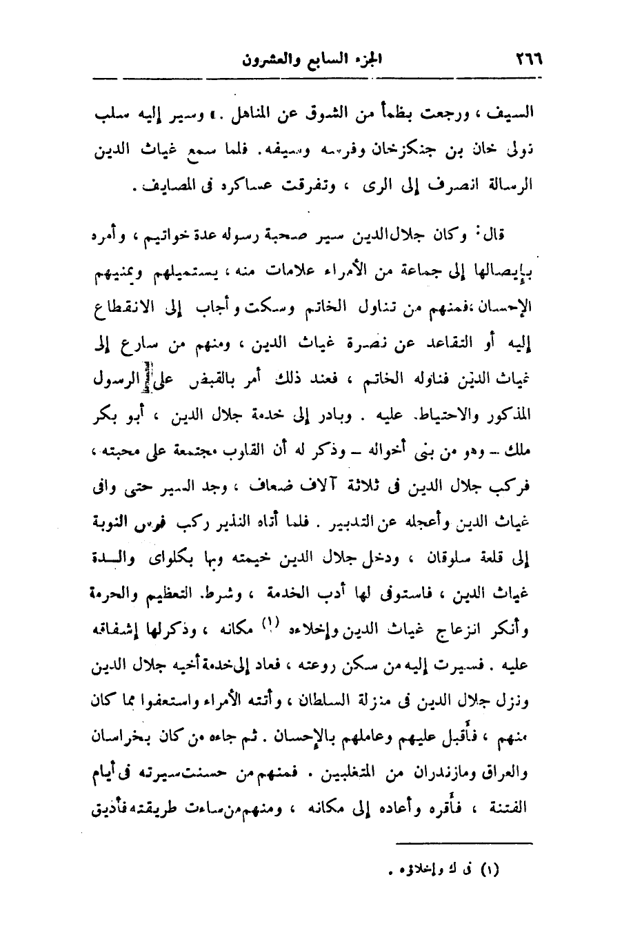 السيف، ورجعت بظمأ من الشوق عن المناهل.» وسير إليه سلب تولى خان بن جنكزخان وفرسه وسيفه. فلما سمع غياث الدين الرسالة انصرف إلى الرى، وتفرقت عساكره فى المصايف.