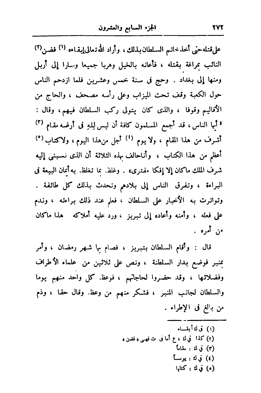 قال: وأقام السلطان بتبريز، فصام بها شهر رمضان، وأمر بمنبر فوضع بدار السلطنة، ونص على ثلاثين من علماء الأطراف وفضلائها، وقد حضروا لحاجاتهم، فوعظ كل واحد منهم يوما والسلطان لجانب المنبر، فشكر منهم من وعظ وقال حقا، وذم من بالغ فى الإطراء.