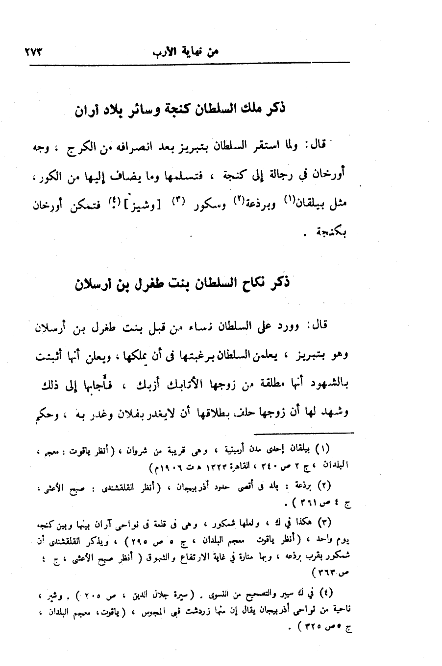 قال: ولما استقر السلطان بتبريز بعد انصرافه من الكرج، وجه أورخان فى رجالة إلى كنجة، فتسلمها وما يضاف إليها من الكور، مثل بيلقان «1» وبرذعة «2» وسكور «3» [وشيز] «4» . فتمكن أورخان بكنجة.