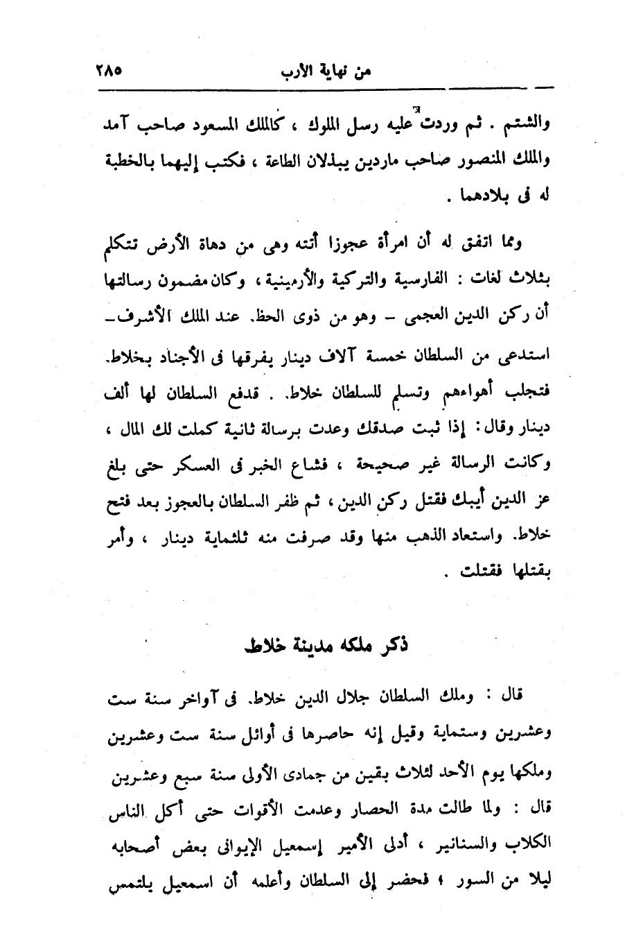 قال: وملك السلطان جلال الدين خلاط فى آواخر سنة ست وعشرين وستماية وقيل إنه حاصرها فى أوائل سنة ست وعشرين وملكها يوم الأحد لئلاث بقين من جمادى الأولى سنة سبع وعشرين قال: ولما طالت مدة الحصار وعدمت الأقوات حتى أكل الناس الكلاب والسنانير، أدلى الأمير إسمعيل الإيوانى بعض أصحابه ليلا من السور؛ فحضر إلى السلطان وأعلمه أن اسمعيل يلتمس