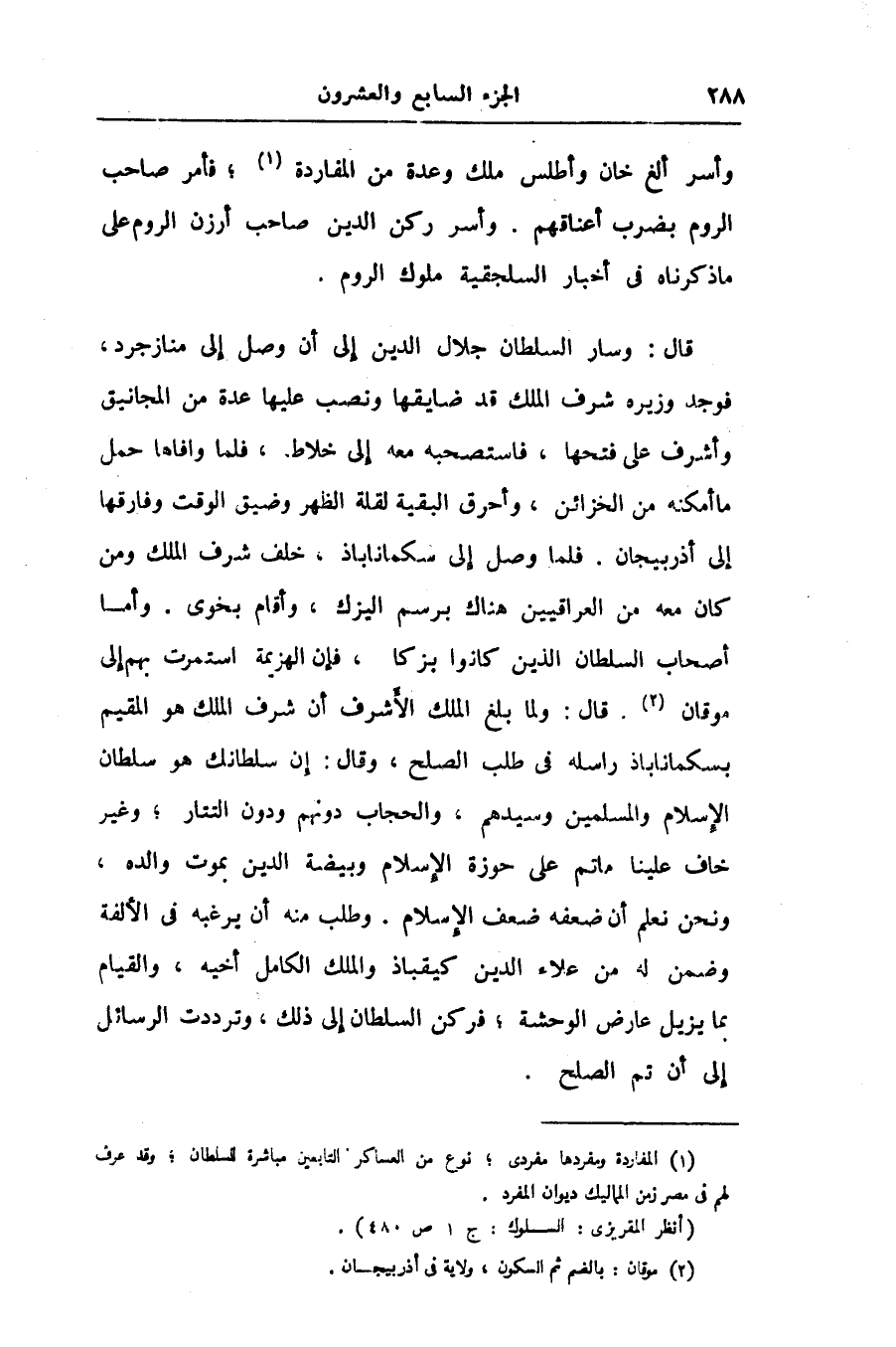 قال: وسار السلطان جلال الدين إلى أن وصل إلى منازجرد، فوجد وزيره شرف الملك قد ضايقها ونصب عليها عدة من المجانيق وأشرف على فتحها، فاستصحبه معه إلى خلاط، فلما وافاها حمل ما أمكنه من الخزائن، وأحرق البقية لقلة الظهر وضيق الوقت وفارقها إلى أذربيجان. فلما وصل إلى سكماناباذ، خلف شرف الملك ومن كان معه من العراقيين هناك برسم اليزك، وأقام بخوى. وأما أصحاب السلطان الذين كانوا بزكا، فإن الهزيمة استمرت بهم إلى موقان «2» . قال: ولما بلغ الملك الأشرف أن شرف الملك هو المقيم بسكماناباذ راسله فى طلب الصلح، وقال: إن سلطانك هو سلطان الإسلام والمسلمين وسيدهم، والحجاب دونهم ودون التتار؛ وغير خاف علينا ماتم على حوزة الإسلام وبيضة الدين بموت والده، ونحن نعلم أن ضعفه ضعف الإسلام. وطلب منه أن يرغبه فى الألفة وضمن له من علاء الدين كيقباذ والملك الكامل أخيه، والقيام بما يزيل عارض الوحشة؛ فركن السلطان إلى ذلك، وترددت الرسائل إلى أن تم الصلح.