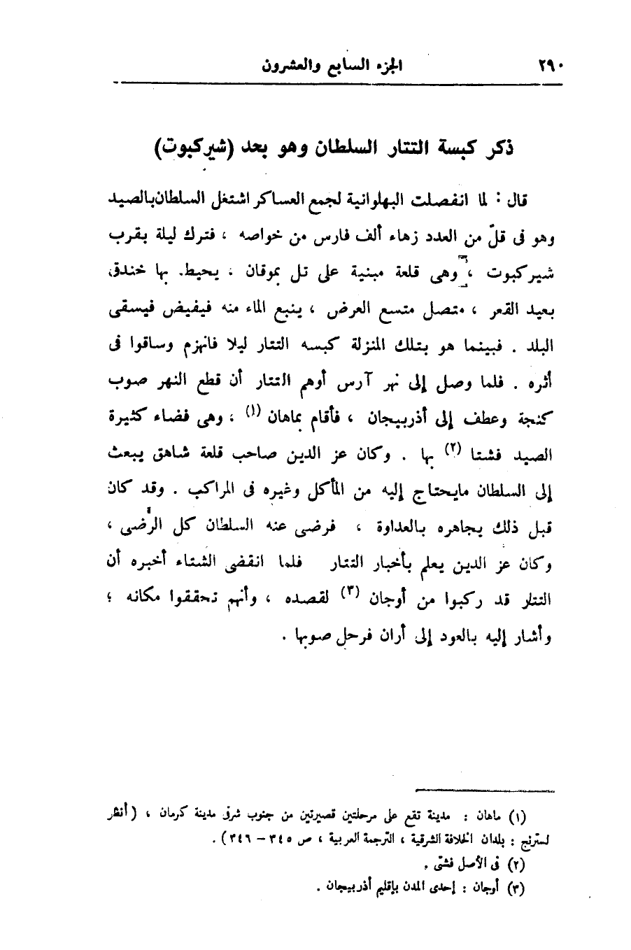 قال: لما انفصلت البهلوانية لجمع العساكر اشتغل السلطان بالصيد وهو فى قلّ من العدد زهاء ألف فارس من خواصه، فترك ليلة بقرب شيركبوت، وهى قلعة مبنية على تل بموقان، يحيط بها خندق بعيد القعر، متصل متسع العرض، ينبع الماء منه فيفيض فيسقى البلد. فبينما هو بتلك المنزلة كبسه التتار ليلا فانهزم وساقوا فى أثره. فلما وصل إلى نهر آرس أوهم التتار أن قطع النهر صوب كنجة وعطف إلى أذربيجان، فأقام بماهان «1» ، وهى فضاء كثيرة الصيد فشتا «2» بها. وكان عز الدين صاحب قلعة شاهق يبعث إلى السلطان ما يحتاج إليه من المأكل وغيره فى المراكب. وقد كان قبل ذلك يجاهره بالعداوة، فرضى عنه السلطان كل الرّضى، وكان عز الدين يعلم بأخبار التتار فلما انقضى الشتاء أخبره أن التتار قد ركبوا من أوجان «3» لقصده، وأنهم تحققوا مكانه؛ وأشار إليه بالعود إلى أران فرحل صوبها.