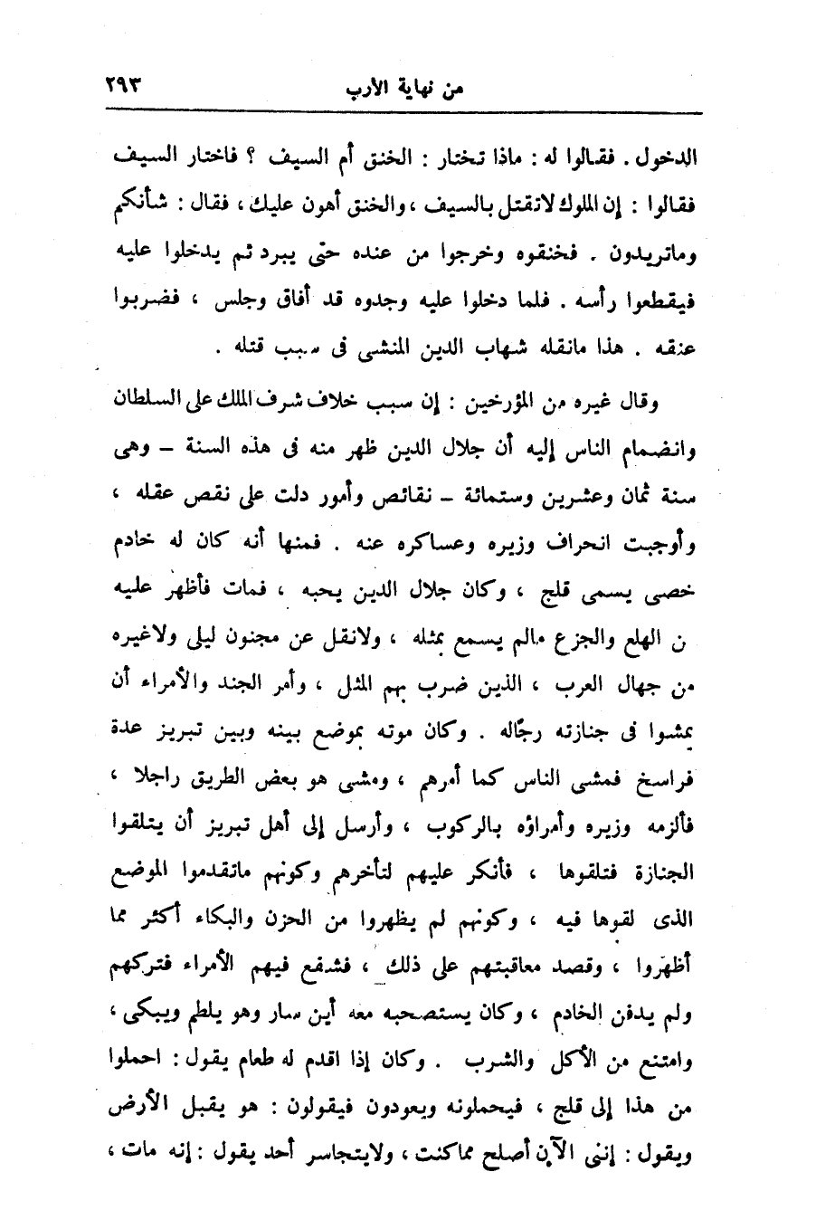 الدخول. فقالوا له: ماذا تختار: الخنق أم السيف؟ فاختار السيف فقالوا: إن الملوك لا تقتل بالسيف، والخنق أهون عليك، فقال: شأنكم وما تريدون. فخنقوه وخرجوا من عنده حتى يبرد ثم يدخلوا عليه فيقطعوا رأسه. فلما دخلوا عليه وجدوه قد أفاق وجلس، فضربوا عنقه. هذا ما نقله شهاب الدين المنشى فى سبب قتله.