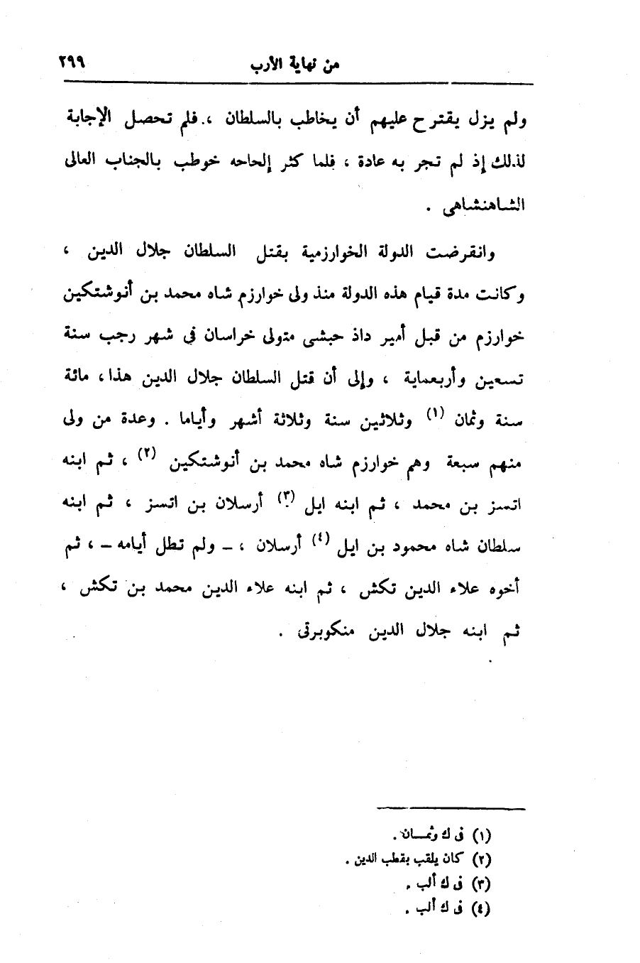 وانقرضت الدولة الخوارزمية بقتل السلطان جلال الدين، وكانت مدة قيام هذه الدولة منذ ولى خوارزم شاه محمد بن أنوشتكين خوارزم من قبل أمير داذ حبشى متولى خراسان فى شهر رجب سنة تسعين وأربعماية، وإلى أن قتل السلطان جلال الدين هذا، مائة سنة وثمان «1» وثلاثين سنة وثلاثة أشهر وأياما. وعدة من ولى منهم سبعة وهم خوارزم شاه محمد بن أنوشتكين «2» ، ثم ابنه اتسز بن محمد، ثم ابنه ايل «3» أرسلان بن اتسز، ثم ابنه سلطان شاه محمود بن ايل «4» أرسلان،- ولم تطل أيامه-، ثم أخوه علاء الدين تكش، ثم ابنه علاء الدين محمد بن تكش، ثم ابنه جلال الدين منكوبرتى.
