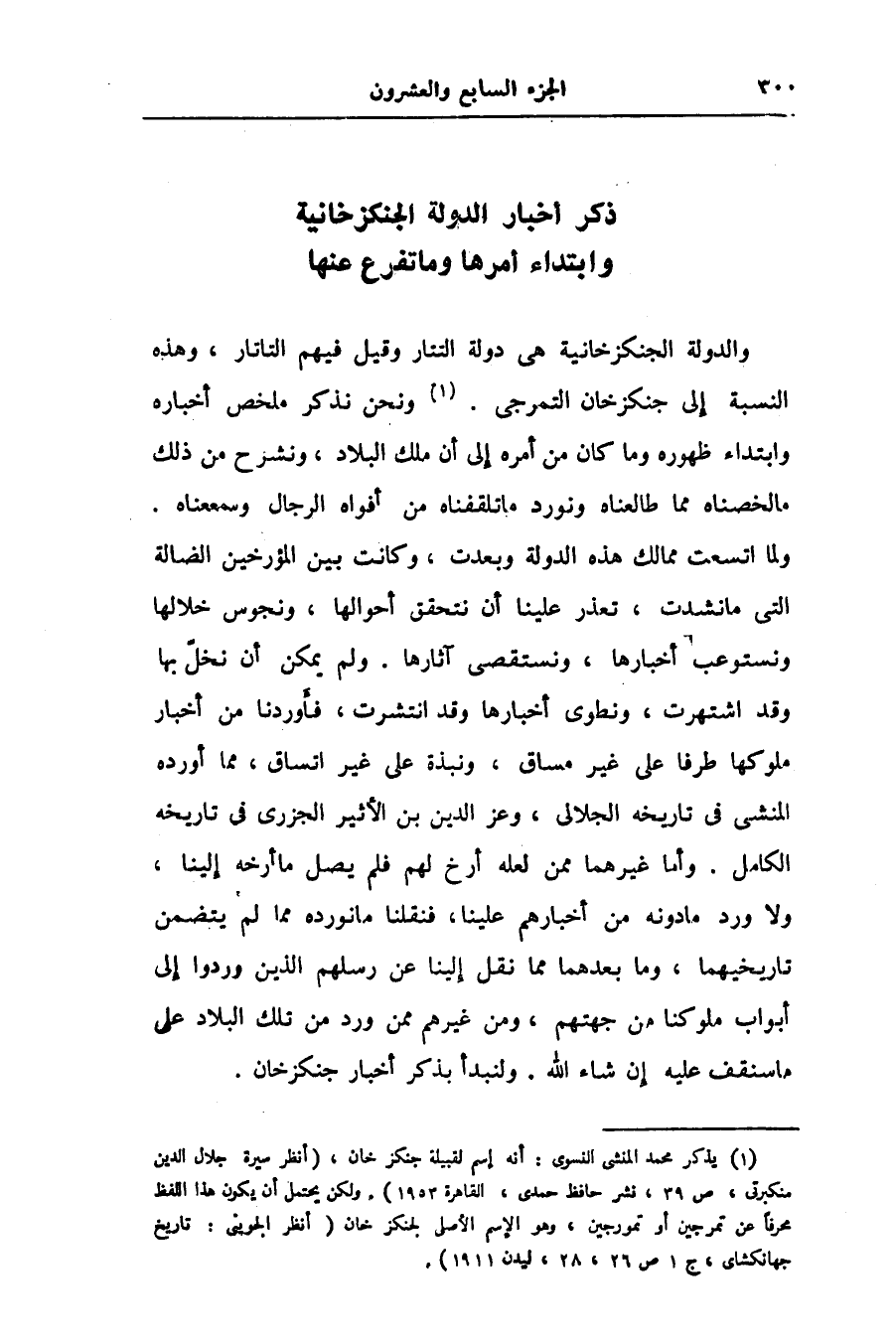 ولما اتسعت ممالك هذه الدولة وبعدت، وكانت بين المؤرخين الضالة التى ما نشدت، تعذر علينا أن نتحقق أحوالها، ونجوس خلالها ونستوعب أخبارها، ونستقصى آثارها. ولم يمكن أن نخلّ بها وقد اشتهرت، ونطوى أخبارها وقد انتشرت، فأوردنا من أخبار ملوكها طرفا على غير مساق، ونبذة على غير اتساق، مما أورده المنشى فى تاريخه الجلالى، وعز الدين بن الأثير الجزرى فى تاريخه الكامل. وأما غيرهما ممن لعله أرخ لهم فلم يصل ما أرخه إلينا، ولا ورد ما دونه من أخبارهم علينا، فنقلنا ما نورده مما لم يتضمن تاريخيهما، وما بعدهما مما نقل إلينا عن رسلهم الذين وردوا إلى أبواب ملوكنا من جهتهم، ومن غيرهم ممن ورد من تلك البلاد على ما سنقف عليه إن شاء الله. ولنبدأ بذكر أخبار جنكزخان.