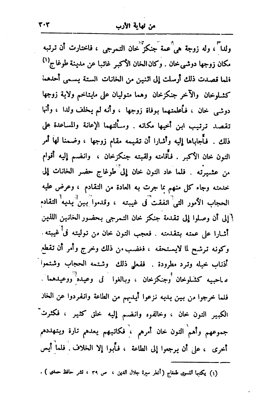 ولدا، وله زوجة هى عمة جنكزخان التمرجى، فاختارت أن ترتبه مكان زوجها دوشى خان. وكان الخان الأكبر غائبا عن مدينة طوغاج «1» فلما قصدت ذلك أرسلت إلى اثنين من الخانات الستة يسمى أحدهما كشلوخان والآخر جنكزخان وهما متوليان على ما يتاخم ولاية زوجها دوشى خان، فأعلمتهما بوفاة زوجها، وأنه لم يخلف ولدا، وأنها تقصد ترتيب ابن أخيها مكانه. وسألتهما الإعانة والمساعدة على ذلك. فأجاباها إليه وأشارا أن تقيمه مقام زوجها، وضمنا لها أمر التون خان الأكبر. فأقامته ولقبته جنكزخان، وانضم إليه أقوام من عشيرته. فلما عاد التون خان إلى طوغاج حضر الخانات إلى خدمته وجاء كل منهم بما جرت به العادة من التقادم، وعرض عليه الحجاب الأمور التى اتفقت فى غيبته، وقدموا بين يديه التقادم إلى أن وصلوا إلى تقدمة جنكزخان التمرجى بحضور الخانين اللذين أشارا على عمته بتقدمته. فعجب التون خان من توليته فى غيبته.