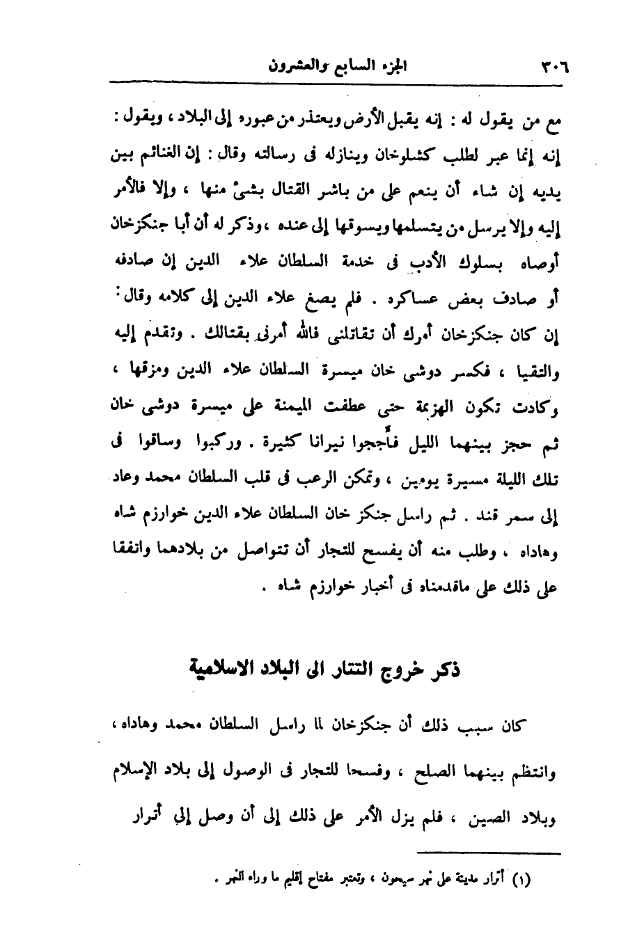 إن كان جنكزخان أمرك أن تقاتلنى فالله أمرنى بقتالك. وتقدم إليه والتقيا، فكسر دوشى خان ميسرة السلطان علاء الدين ومزقها، وكادت تكون الهزيمة حتى عطفت الميمنة على ميسرة دوشى خان ثم حجز بينهما الليل فأججوا نيرانا كثيرة. وركبوا وساقوا فى تلك الليلة مسيرة يومين، وتمكن الرعب فى قلب السلطان محمد وعاد إلى سمرقند. ثم راسل جنكزخان السلطان علاء الدين خوارزم شاه وهاداه، وطلب منه أن يفسح للتجار أن تتواصل من بلادهما واتفقا على ذلك على ما قدمناه فى أخبار خوارزم شاه.