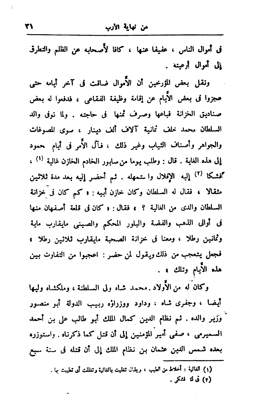 ونقل بعض المؤرخين أن الأموال ضاقت فى آخر أيامه حتى عجزوا فى بعض الأيام عن إقامة وظيفة الفقاعى، فدفعوا له بعض صناديق الخزانة فباعها وصرف ثمنها فى حاجته. ولما توفى والد السلطان محمد خلف ثمانية آلاف ألف دينار، سوى المصوغات والجواهر وأصناف الثياب وغير ذلك، فآل الأمر فى أيام محمود إلى هذه الغاية. قال: وطلب يوما من سابور الخادم الخازن غالية «1» ، فشكا «2» إليه الإقلال واستمهله. ثم أحضر إليه بعد مدة ثلاثين مثقالا، فقال له السلطان وكان خازن أبيه: «كم كان فى خزانة السلطان والدى من الغالية؟» فقال: «كان فى قلعة أصفهان منها فى أوانى الذهب والفضة والبلور المحكم والصينى ما يقارب ماية وثمانين رطلا، ومعنا فى خزانة الصحبة ما يقارب ثلاثين رطلا» فجعل يتعجب من ذلك ويقول لمن حضر: اعجبوا من التفاوت بين هذه الأيام وتلك» .