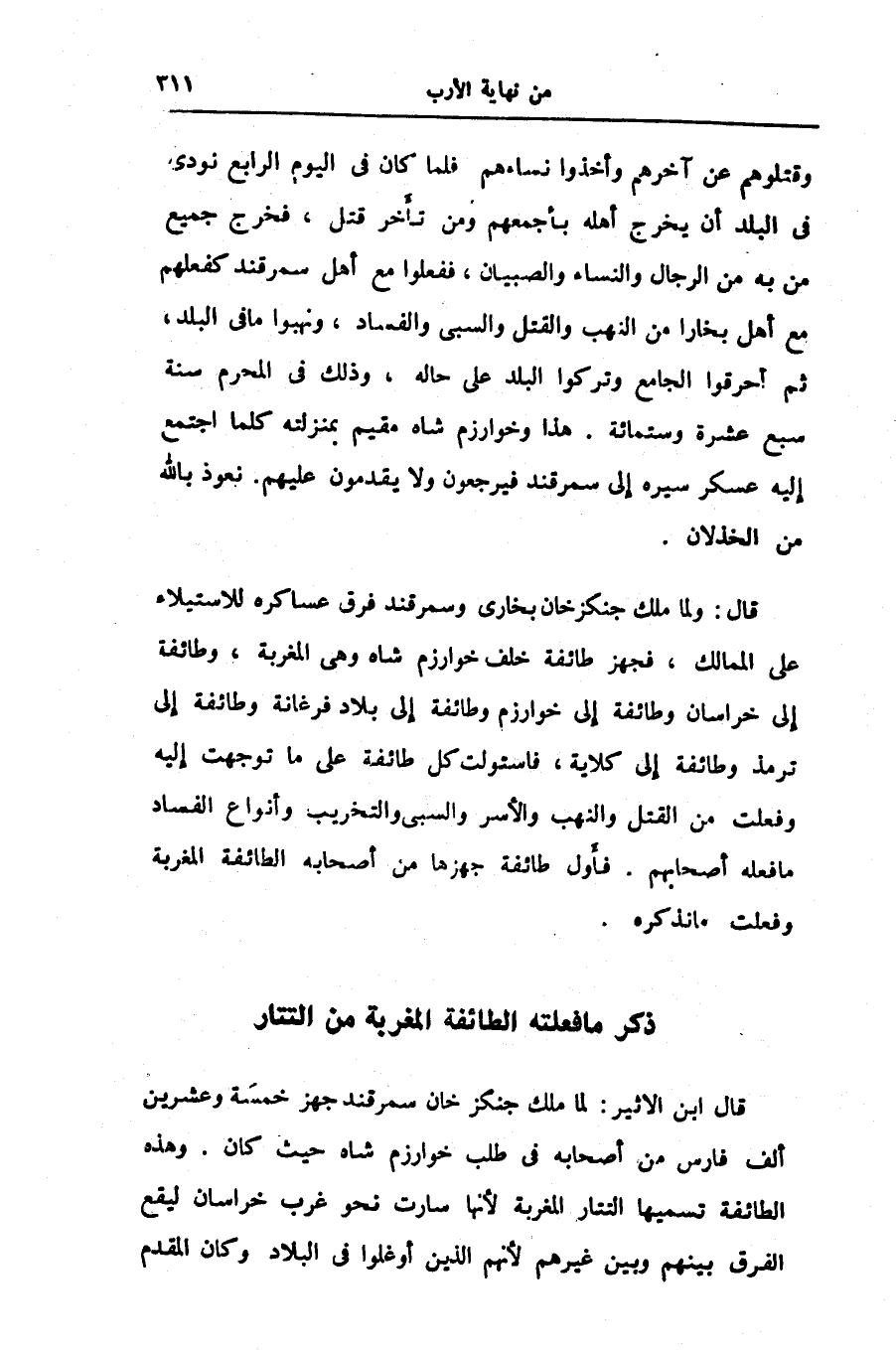 وقتلوهم عن آخرهم وأخذوا نساءهم فلما كان فى اليوم الرابع نودى فى البلد أن يخرج أهله بأجمعهم ومن تأخر قتل، فخرج جميع من به من الرجال والنساء والصبيان، ففعلوا مع أهل سمرقند كفعلهم مع أهل بخارا من النهب والقتل والسبى والفساد، ونهبوا ما فى البلد، ثم أحرقوا الجامع وتركوا البلد على حاله، وذلك فى المحرم سنة سبع عشرة وستمائة. هذا وخوارزم شاه مقيم بمنزلته كلما اجتمع إليه عسكر سيره إلى سمرقند فيرجعون ولا يقدمون عليهم. نعوذ بالله من الخذلان.