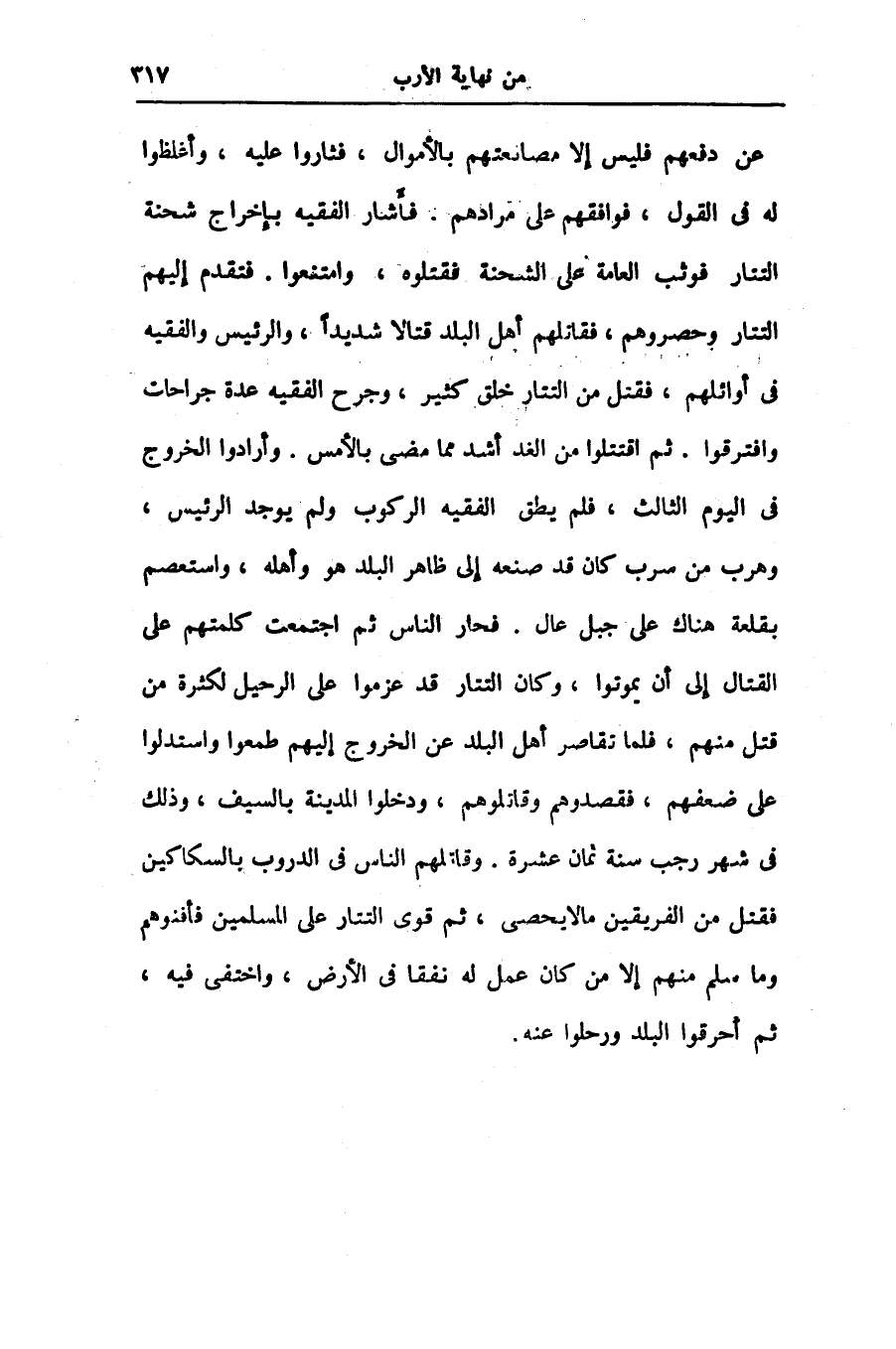 عن دفعهم فليس إلا مصانعتهم بالأموال، فثاروا عليه، وأغلظوا له فى القول، فوافقهم على مرادهم. فأشار الفقيه بإخراج شحنة التتار فوثب العامة على الشحنة فقتلوه، وامتنعوا. فتقدم إليهم التتار وحصروهم، فقاتلهم أهل البلد قتالا شديدا، والرئيس والفقيه فى أوائلهم، فقتل من التتار خلق كثير، وجرح الفقيه عدة جراحات وافترقوا. ثم اقتتلوا من الغد أشد مما مضى بالأمس. وأرادوا الخروج فى اليوم الثالث، فلم يطق الفقيه الركوب ولم يوجد الرئيس، وهرب من سرب كان قد صنعه إلى ظاهر البلد هو وأهله، واستعصم بقلعة هناك على جبل عال. فحار الناس ثم اجتمعت كلمتهم على القتال إلى أن يموتوا، وكان التتار قد عزموا على الرحيل لكثرة من قتل منهم، فلما تقاصر أهل البلد عن الخروج إليهم طمعوا واستدلوا على ضعفهم، فقصدوهم وقاتلوهم، ودخلوا المدينة بالسيف، وذلك فى شهر رجب سنة ثمان عشرة. وقاتلهم الناس فى الدروب بالسكاكين فقتل من الفريقين ما لا يحصى، ثم قوى التتار على المسلمين فأفنوهم وما سلم منهم إلا من كان عمل له نفقا فى الأرض، واختفى فيه، ثم أحرقوا البلد ورحلوا عنه.