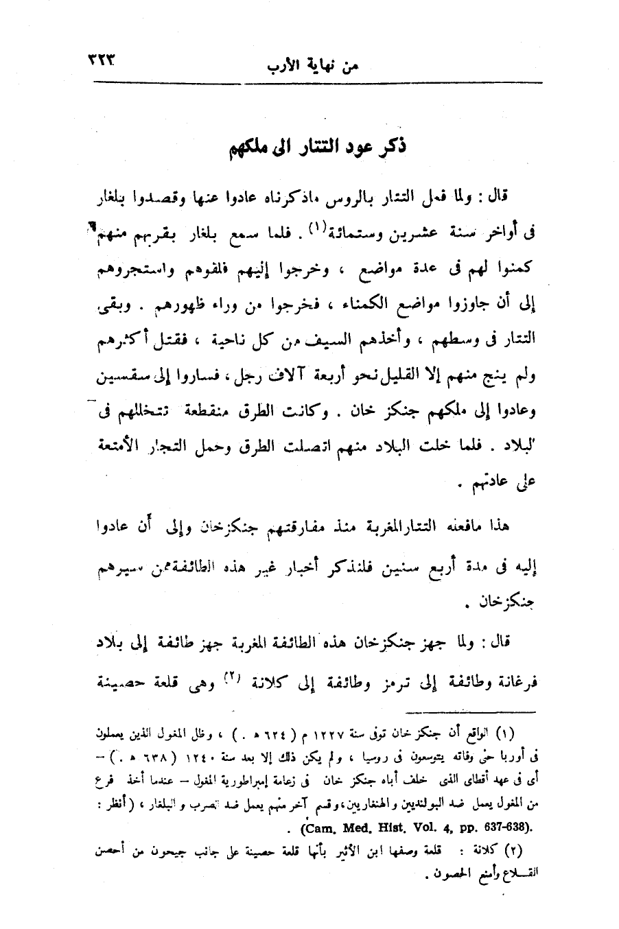 هذا ما فعله التتار المغربة منذ مفارقتهم جنكزخان وإلى أن عادوا إليه فى مدة أربع سنين فلنذكر أخبار غير هذه الطائفة ممن سيرهم جنكزخان.