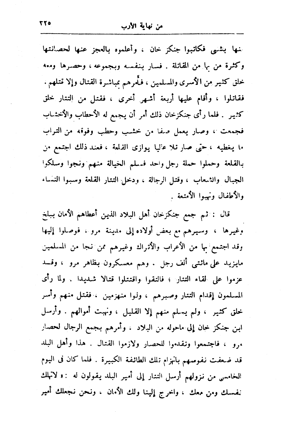 قال: ثم جمع جنكزخان أهل البلاد الذين أعطاهم الأمان ببلخ وغيرها، وسيرهم مع بعض أولاده إلى مدينة مرو، فوصلوا إليها وقد اجتمع بها من الأعراب والأتراك وغيرهم ممن نجا من المسلمين ما يزيد على مائتى ألف رجل، وهم معسكرون بظاهر مرو، وقد عزموا على لقاء التتار؛ فالتقوا واقتتلوا قتالا شديدا. ولما رأى المسلمون إقدام التتار وصبرهم، ولوا منهزمين، فقتل منهم وأسر خلق كثير، ولم يسلم منهم إلا القليل، ونهبت أموالهم. وأرسل ابن جنكزخان إلى ما حوله من البلاد، وأمرهم بجمع الرجال لحصار مرو، فاجتمعوا وتقدموا للحصار ولازموا القتال. هذا وأهل البلد قد ضعفت نفوسهم بانهزام تلك الطائفة الكبيرة. فلما كان فى اليوم الخامس من نزولهم أرسل التتار إلى أمير البلد يقولون له: «لا تهلك نفسك ومن معك، واخرج إلينا ولك الأمان، ونحن نجعلك أمير