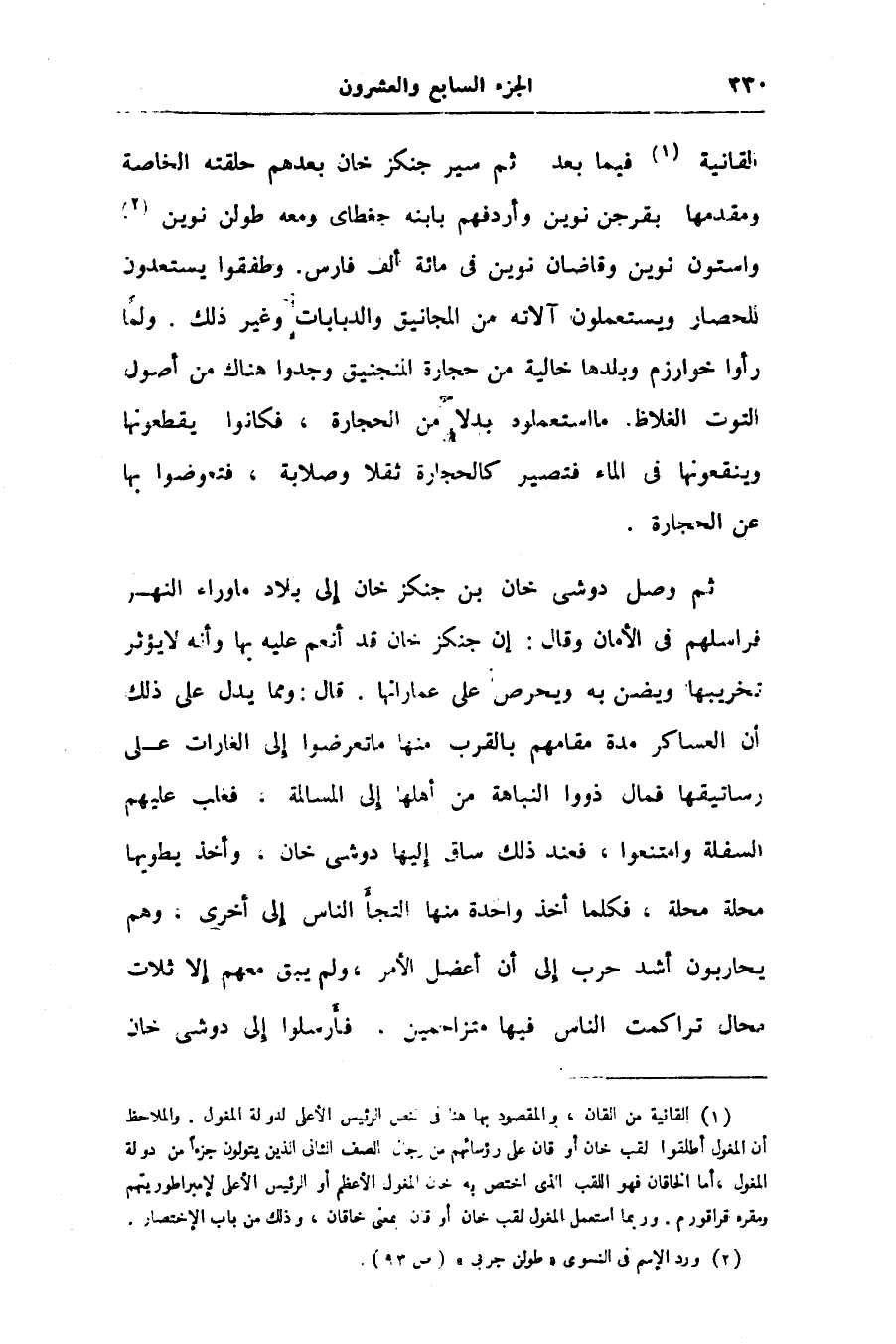 القانية «1» فيما بعد ثم سير جنكزخان بعدهم حلقته الخاصة ومقدمها بقرجن نوين وأردفهم بابنه جغطاى ومعه طولن نوين «2» واستون نوين وقاضان نوين فى مائة ألف فارس. وطفقوا يستعدون للحصار ويستعملون آلاته من المجانيق والدبابات وغير ذلك. ولما رأوا خوارزم وبلدها خالية من حجارة المنجنيق وجدوا هناك من أصول التوت الغلاظ ما استعملوه بدلا من الحجارة، فكانوا يقطعونها وينقعونها فى الماء فتصير كالحجارة ثقلا وصلابة، فتعوضوا بها عن الحجارة.