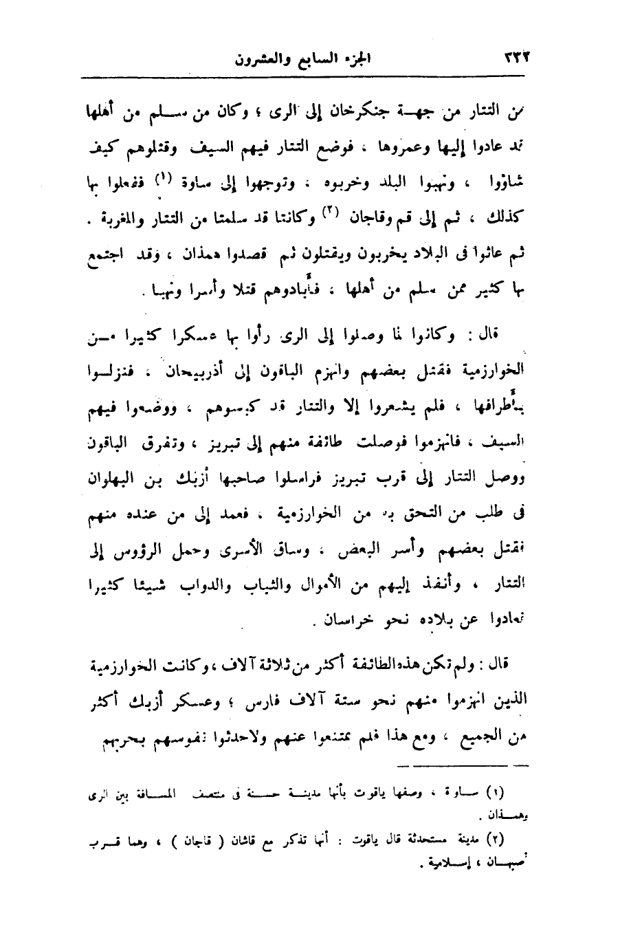 من التتار من جهة جنكزخان إلى الرى؛ وكان من سلم من أهلها قد عادوا إليها وعمروها، فوضع التتار فيهم السيف وقتلوهم كيف شاؤوا، ونهبوا البلد وخربوه، وتوجهوا إلى ساوة «1» ففعلوا بها كذلك، ثم إلى قم وقاجان «2» وكانتا قد سلمتا من التتار والمغربة.